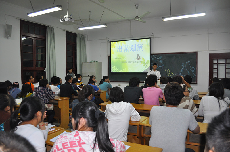 本次交流会分为两项议程。第一项议程是专为十一过后各班的“土特产交流会”准备的——土特产交流会动员大会。大会在办公室副主任顾怡康诙谐幽默的讲演中拉开帷幕,紧接着,刘悦同学向大一新一届班委展示了去年我院各班承办土特产交流会时的一些活动剪影,看到一张张绚丽缤纷的活动照片,台下的大一新生们也露出了欣喜的神情,看得出,他们对即将开始的“土特产交流会”也抱有浓厚的兴趣。相信十一归来,他们会带着自己的创意策划好各班的“土特产交流会”。