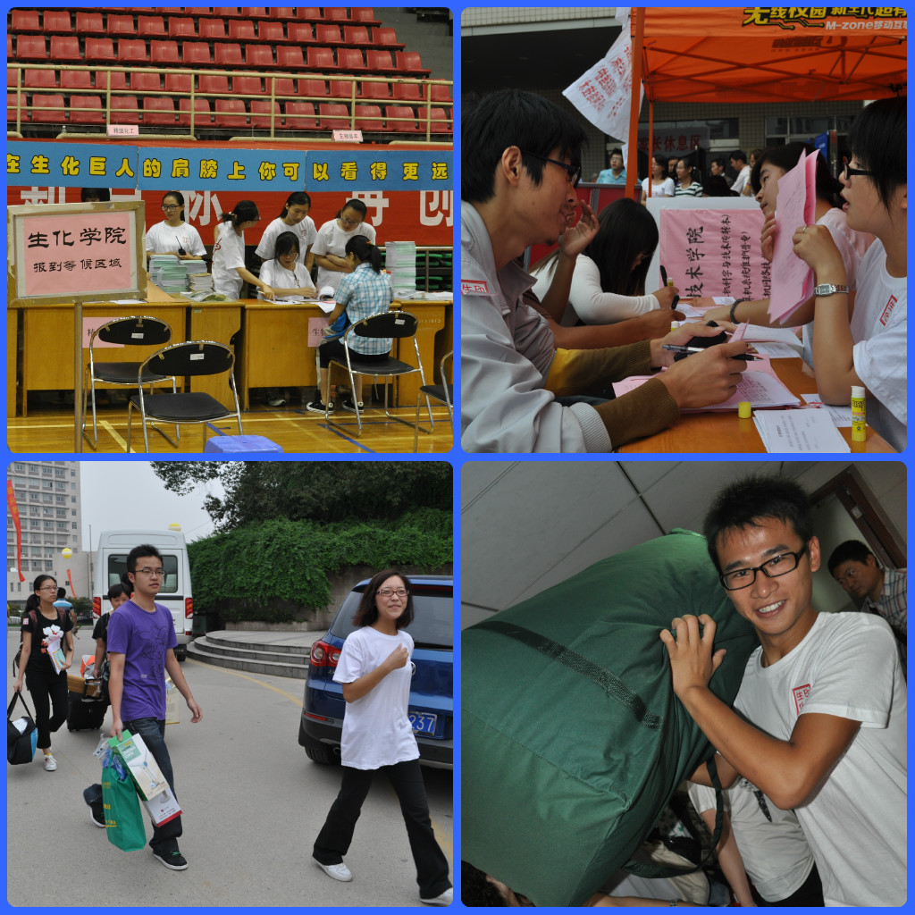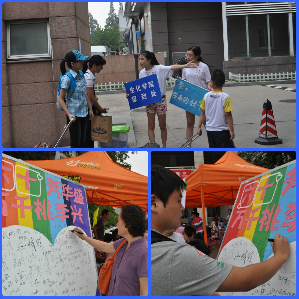 为了体现我院的人文主义精神,今年的迎新工作可谓精致仔细、创意层出。一进校门,便可看见我院志愿者高举标语迎接。标语根据时段各有不同,分别为“亲,你来得好早!”、“亲,你热吗?”和“谢天谢地,你终于来了!”。这些标语贴近学生心理,体现出我院对于新生的亲切关怀。随后,新生由引导人员带领至外场报名点进行报名,报名时志愿者将我院精心设计的印章贴纸“生化印象”贴在新生身上,让新生第一时间对生化学院产生极大的融入感。我院为祝福母校60华诞,在外场区设立了题为“六十芳华盛,万千桃李兴”的签名板,广大师生在签名板上签名庆贺,成为一道亮丽的风景线。外场区的报到结束后,新生由我院引导员带领至内场报名点进行报名。在内场区,我院设计了“站在生化巨人的肩上你会看得更远”的挂牌,旨在让新生感受到生化的魅力。所有报名流程结束后,引导员将新生带领至宿舍区。在那里,我们的志愿者全程帮助新生领取钥匙、提送包裹,让新生感受到无微不至的照顾。我院所有志愿者都统一穿着背后印有寓意“生化!神话!”的“生化神”字样的白色服装,这样既体现了我院的特色,也可以让新生能够迅速找到志愿者寻求帮助。