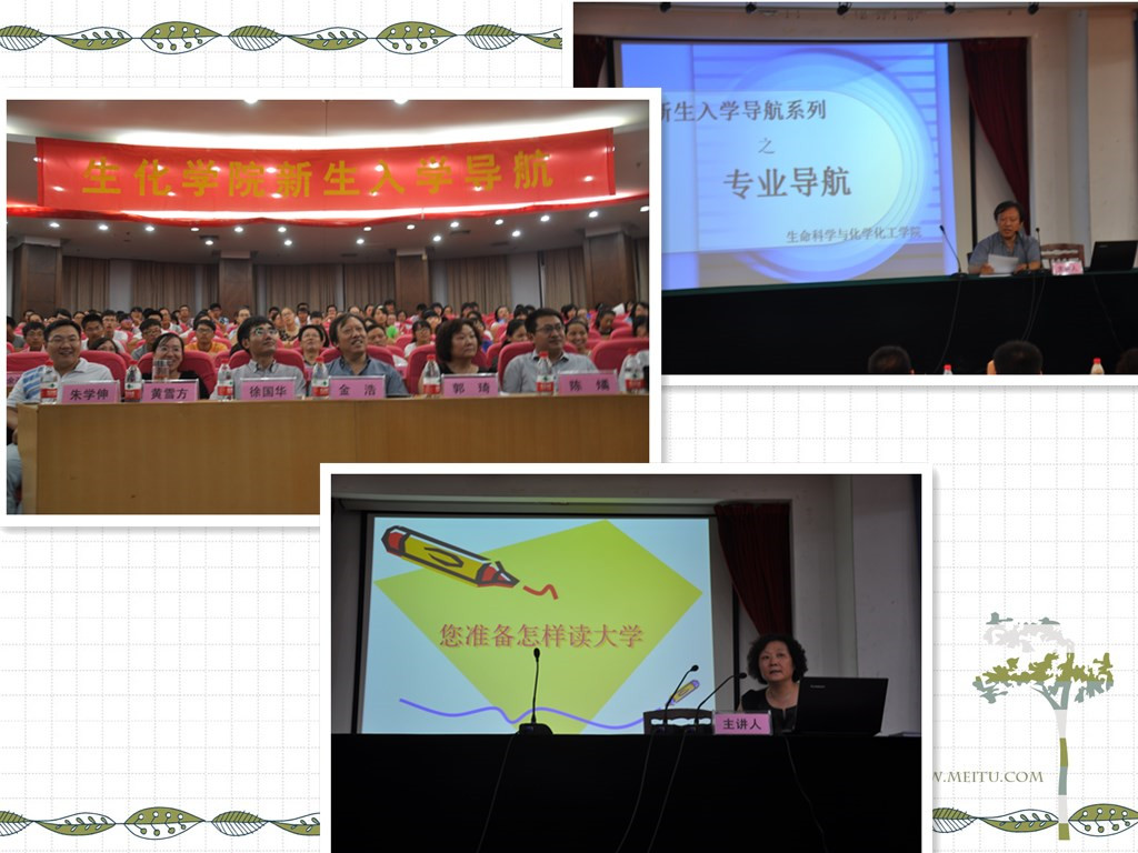 本次讲座中,同学们首先从金院长处了解到了我院的发展历程、师资力量、良好的就业前景等信息。接着,郭书记十分细致的讲述了我院学生管理方面的一些规章制度。然后,徐国华老师生动形象的介绍了中国教育和国外教育的区别,并呼吁大家在大学中要把握机会刻苦学习。最后由花书贵和朱学伸老师分别讲述了化学和生物学科的学习方法以及考研就业前景。