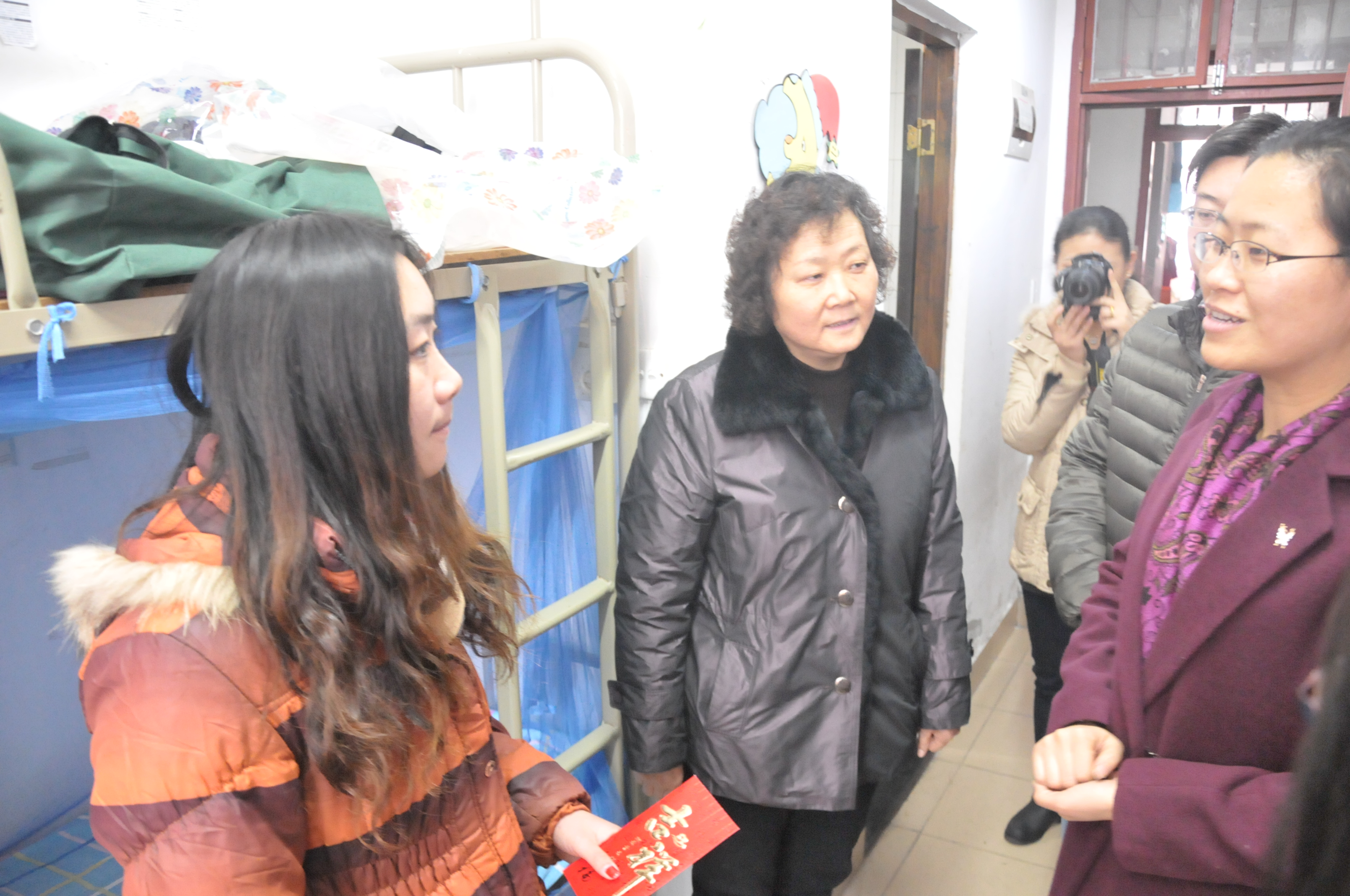 2014年1月10日下午,在我校学工处刘莹处长的带领下,校学工处、校团委领导及我院党总支郭琦书记一行人来到了三味书屋女生宿舍,把学校的亲切关怀和爱心基金带给我院12级工业分析专业的贾银杏同学。