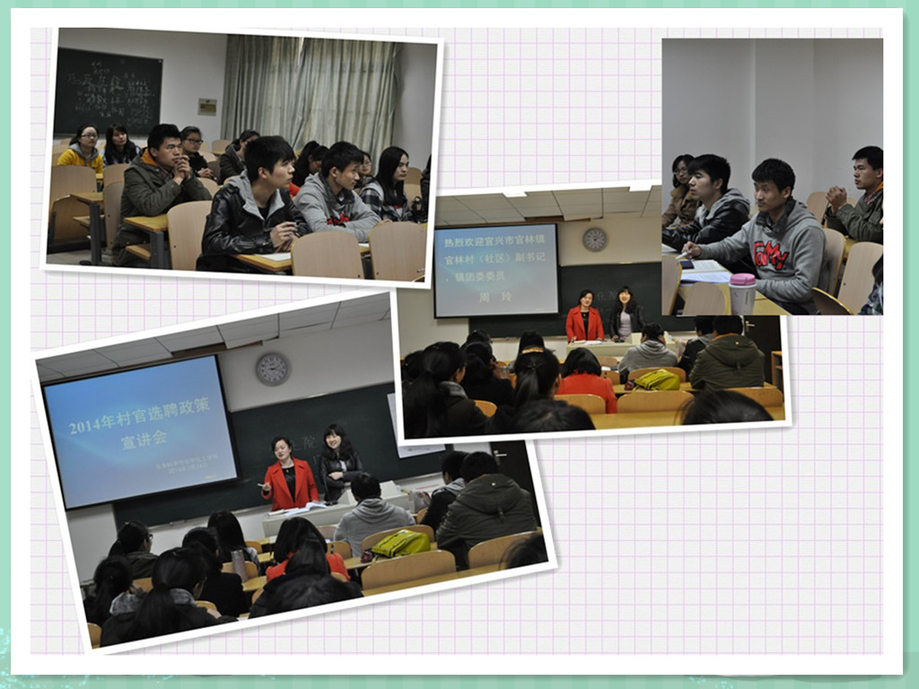 为响应2014年江苏省选聘高校在校毕业生到村任职通知,积极组织大学生到基层为广大民众服务,我院于2014年3月24日在教③楼107教室进行了村官选聘政策宣讲会。本次宣讲会由我院就业专员