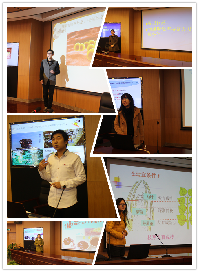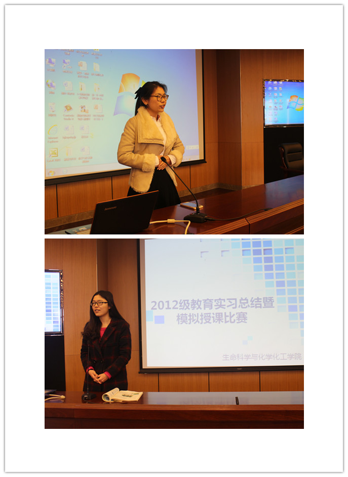 大会分为三个议程,第一个议程:我院金浩院长就教育实习情况进行了总结,生化学院2012级生物、化学普本班91名同学于2015年9月21日至2014年12月25日分赴江苏省内相关中小学,为期十五周的教育实习圆满完成。第二个议程,由生物和化学两个专业选拔出的6名同学进行模拟授课比赛。江苏省第四届师范生教学基本功大赛获得一等奖和二等奖的两名生物专业的同学孔玥和王怡上台展示成果,与台下的同学分享经验。这是我院历届比赛获得的最优成绩。两名同学在台上的自信的展示赢得了老师和同学们的阵阵掌声。