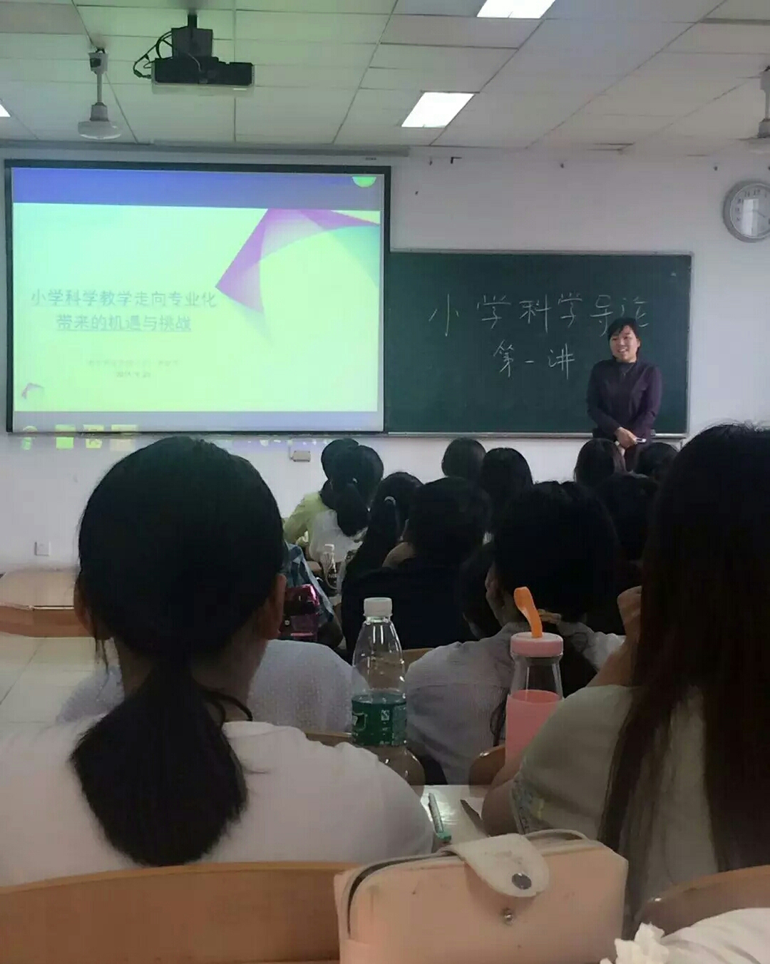 单校长以小学科学教学走向专业带来的机遇和挑战为话题,通过举例就当前小学科学课的教学变化与要求以及个人学习规划的制定提出建议,让每一位在座的学生清楚地看到小学科学专业的未来发展方向。秦淮区科学教研员夏老师为我们回顾了二十世纪至今,美国等几个大家的科学教育发展,并为我们详细地解读了课程标准的作用,以及如何运用好课程标准。在场的同学们认真地听讲,仔细地记录,获益匪浅。