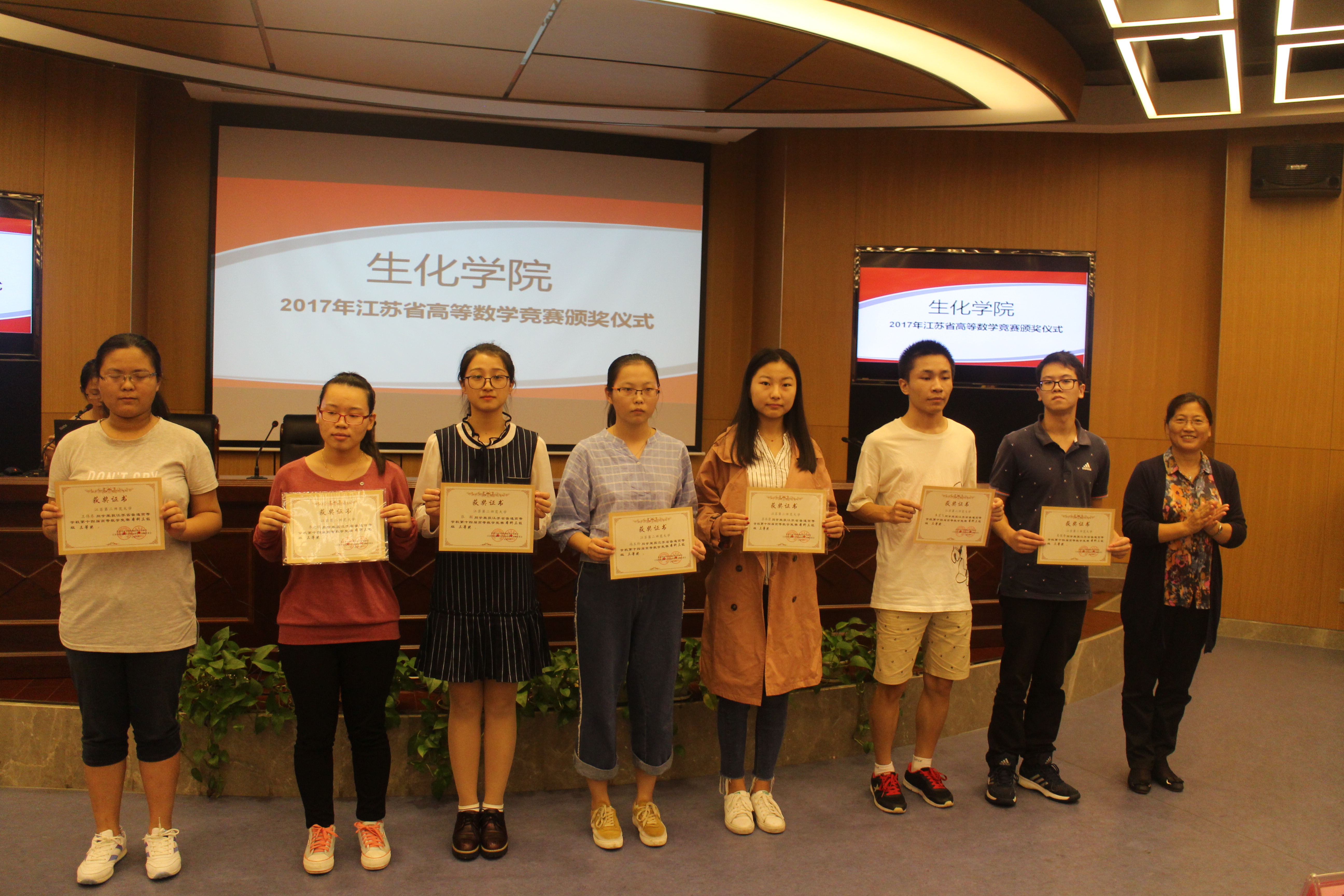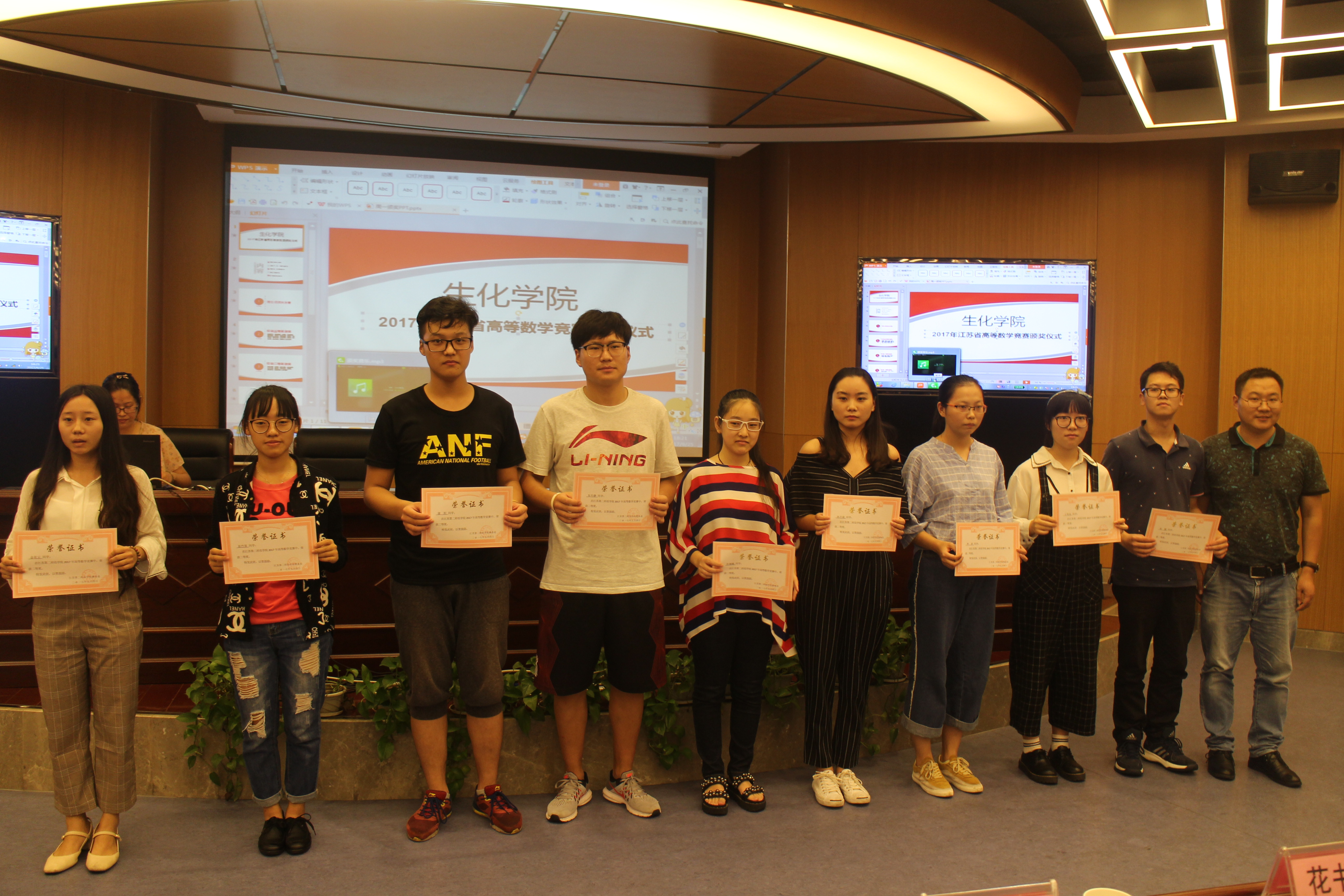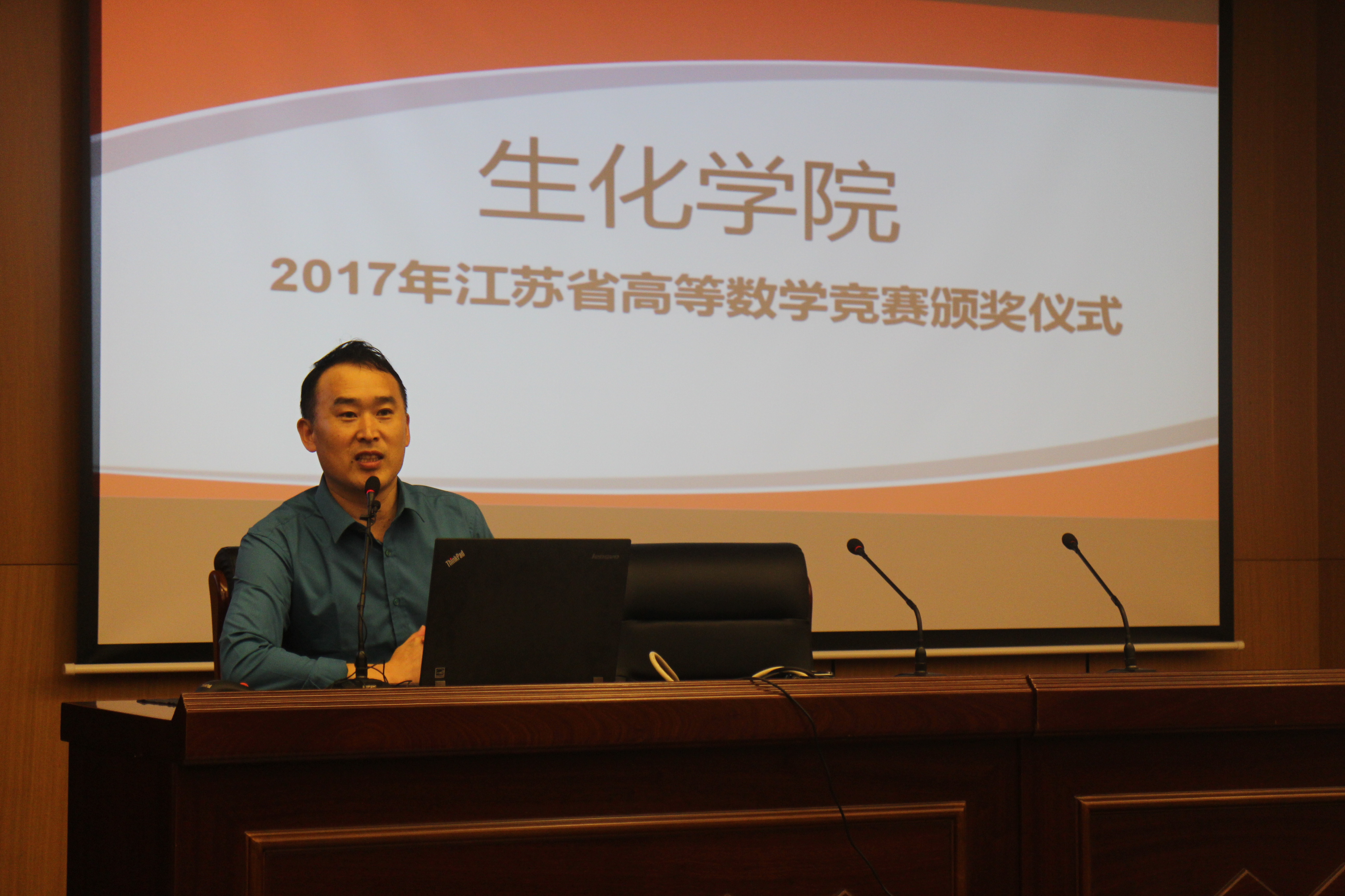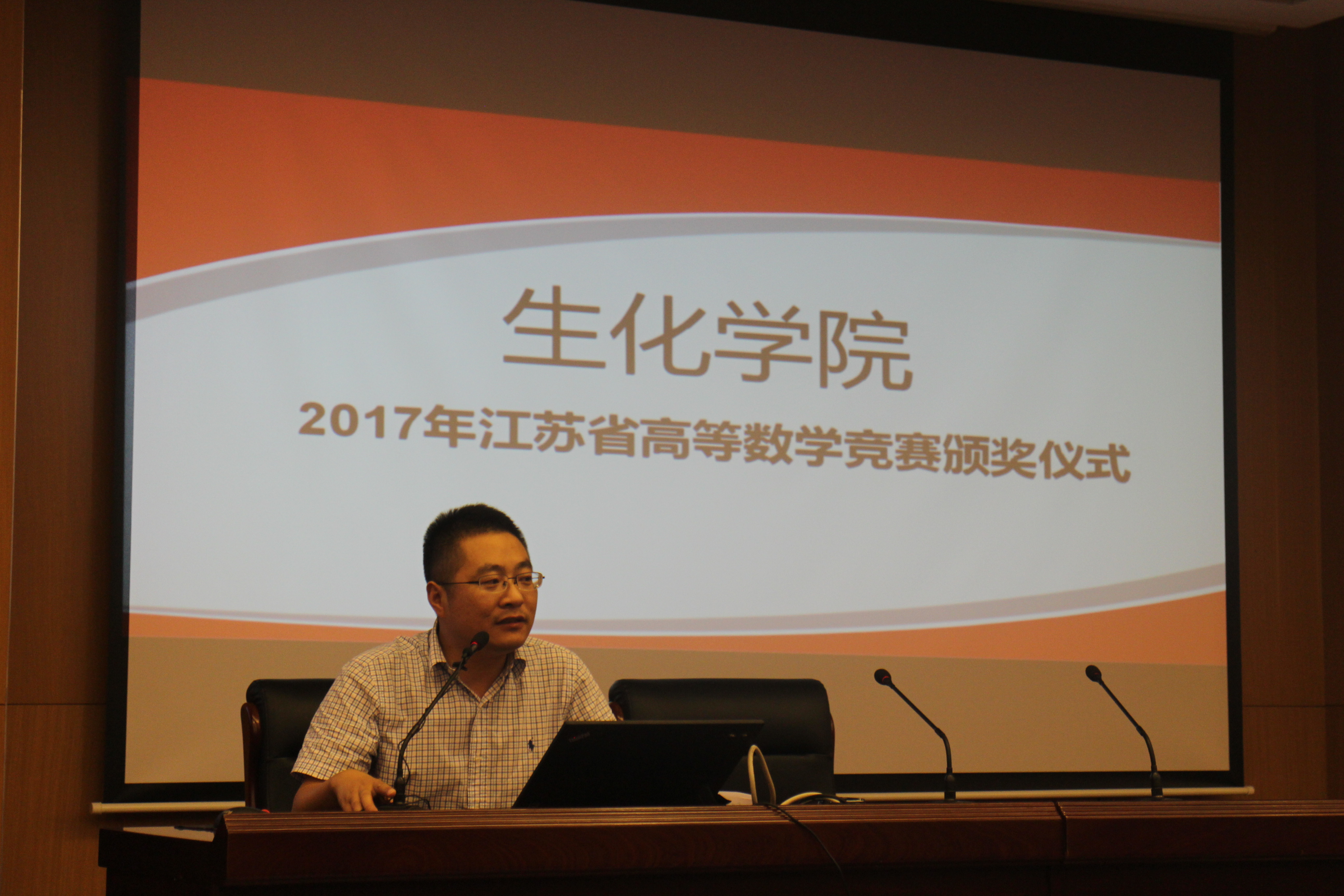 2017年9月25日晚六点,我院在现教楼二楼报告厅举行了2017年江苏省高等数学竞赛获奖选手颁奖仪式。出席本次颁奖仪式的有生化学院院长蒋功成老师、生化学院党总支书记陈建琴老师、生化学院副院长花书贵老师、生化学院副院长朱学伸老师,以及学工办主任朱琨老师,辅导员罗马亚老师,辅导员潘倩老师主持颁奖仪式。
