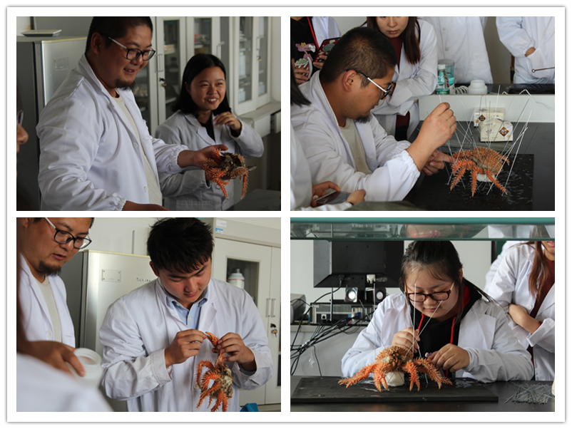 在活动中,黄悦老师向每位同学演示制作栗刺仿石蟹标本的方法,详细说明制作过程中的注意事项。所有同学围绕在老师周围,仔细观看老师手上动作,聆听老师的讲解。