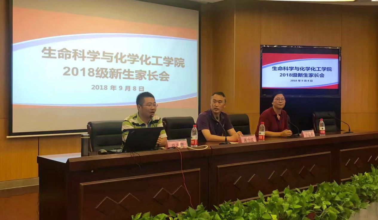 蒋功成向到会的家长们简要介绍了江苏第二师范学院的发展历史,重点介绍了生化学院的人才培养方向和质量、师资队伍情况和拥有的省级重点学科实验室及其师范特色以及溧水新校区情况。