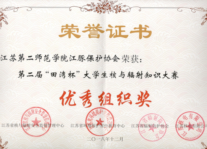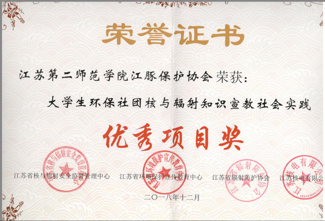本次活动,我院江豚保护协会获得了第二届“田湾杯”大学生核与辐射知识大赛“优秀组织奖”和大学生环保社团核与辐射知识宣教社会实践“优秀项目奖”。