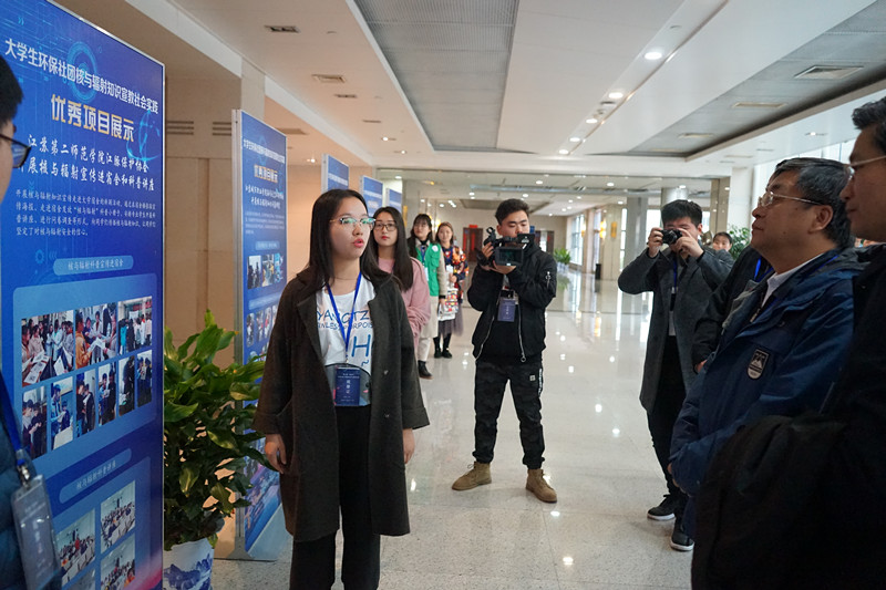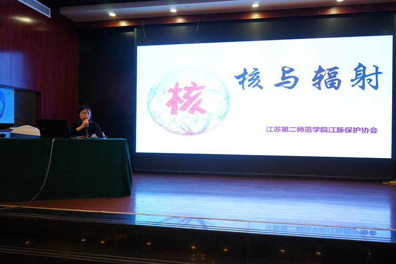 在核与辐射知识大赛辩论赛观摩现场,协会骨干成员李思慧同学向环保部辐射源安全监管司副司长赵永明、连云港市副市长徐家保等与会领导和嘉宾介绍了我校江豚协会围绕“保护长江江豚,保护长江生态”所开展的系列活动和“自然而然”科普公益创新计划等特色项目,活动所体现的特色性、专业性和社会意义受到了领导嘉宾的一致肯定和赞扬。