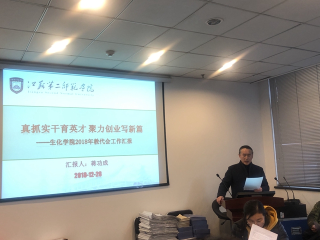 12月26日下午,生化学院在草场门校区现代教育技术楼1202会议室召开首届教职工代表大会。会议由院党总支书记陈建琴主持,院长蒋功成作《真抓实干育英才 聚力创业写新篇——生命科学与化学化工学院2018年教代会工作报告》。分工会主席朱琨作《生命科学与化学化工学院分工会2018年度工作总结》。