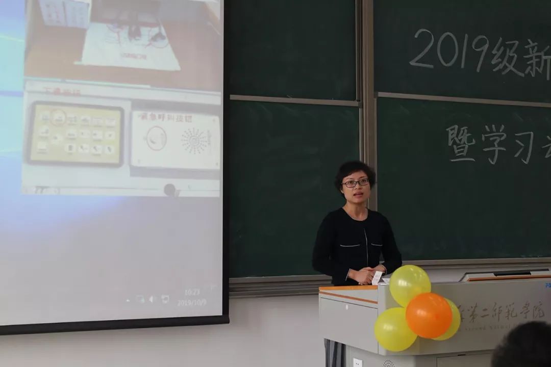院学生会主席阮依作为老生代表也发表了演讲,她送给了新生们两个字,分别是“定”和“拓”,“定”意为希望大家可以在大学四年中,制定好规划,坚定住目标,坚定这四年,握紧四载春华。而“拓”则是希望新生可开拓眼界,多多参加各类团队组织,参加各项活动,磨练自己的技能,提前拥有一个合格教师的技能。