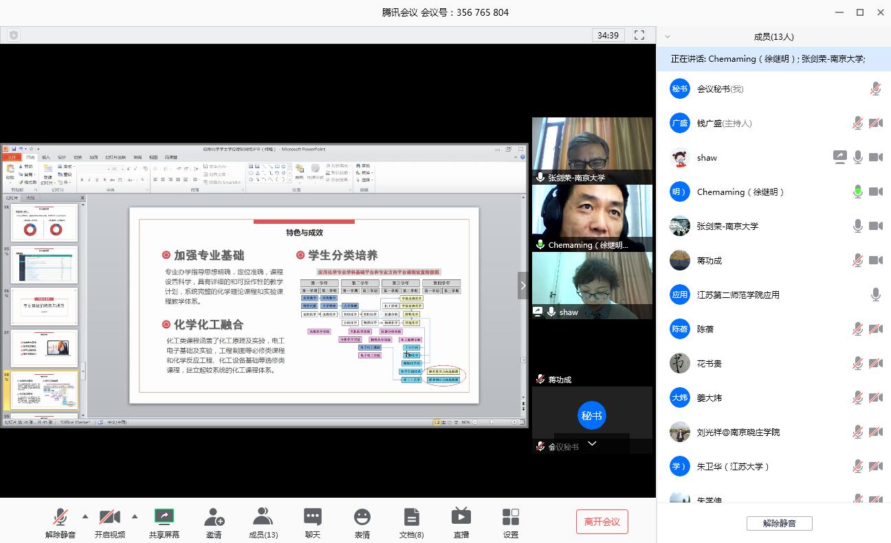 第三阶段,专家组对照《江苏省普通高等学校学士学位授权专业评审指标体系》进行打分和投票,张剑荣代表专家组反馈专业评审意见。专家组一致认为我院应用化学专业具备学士学位授予条件,建议江苏省学位委员会将应用化学专业增列为学士学位授权专业。