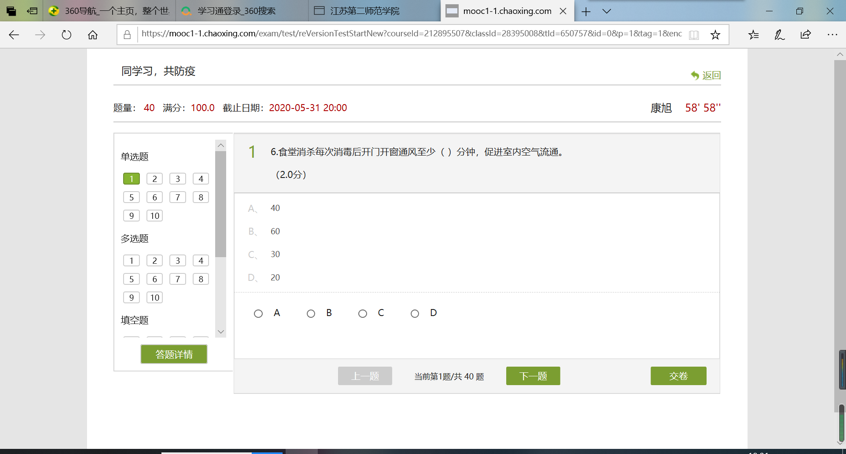 为进一步做好学生返校后校园疫情防控宣传工作,加强我院同学对疫情相关知识的了解,消除对于疫情不必要的恐慌,生化学院学工办于5月31日开展了“同学习,共防疫”新冠肺炎防控知识测试主题活动。本次活动以线下学习和线上考试的形式同时展开。