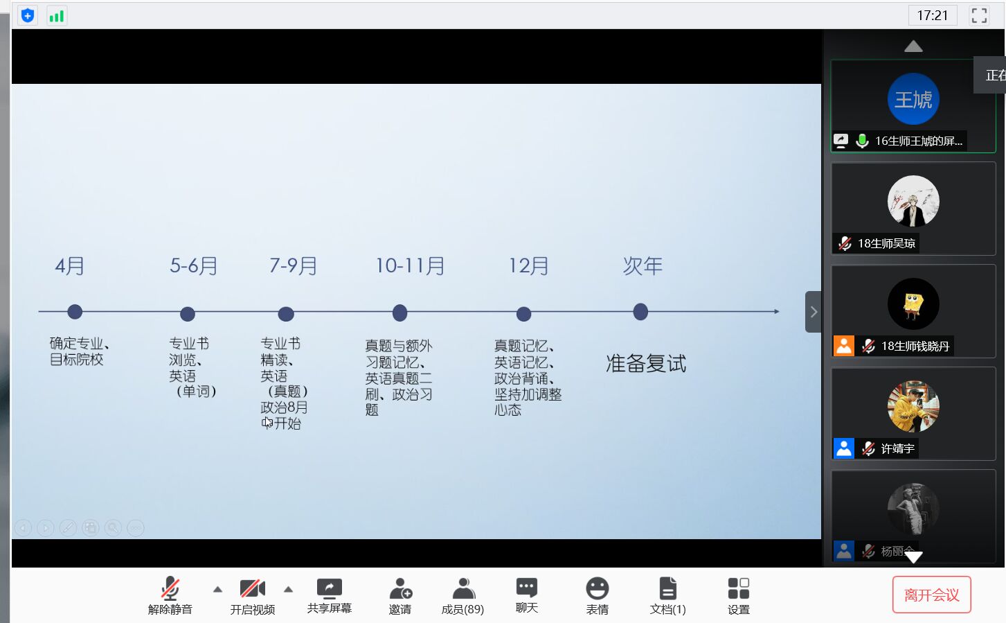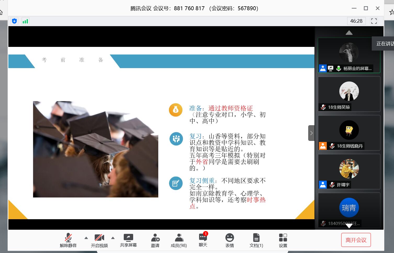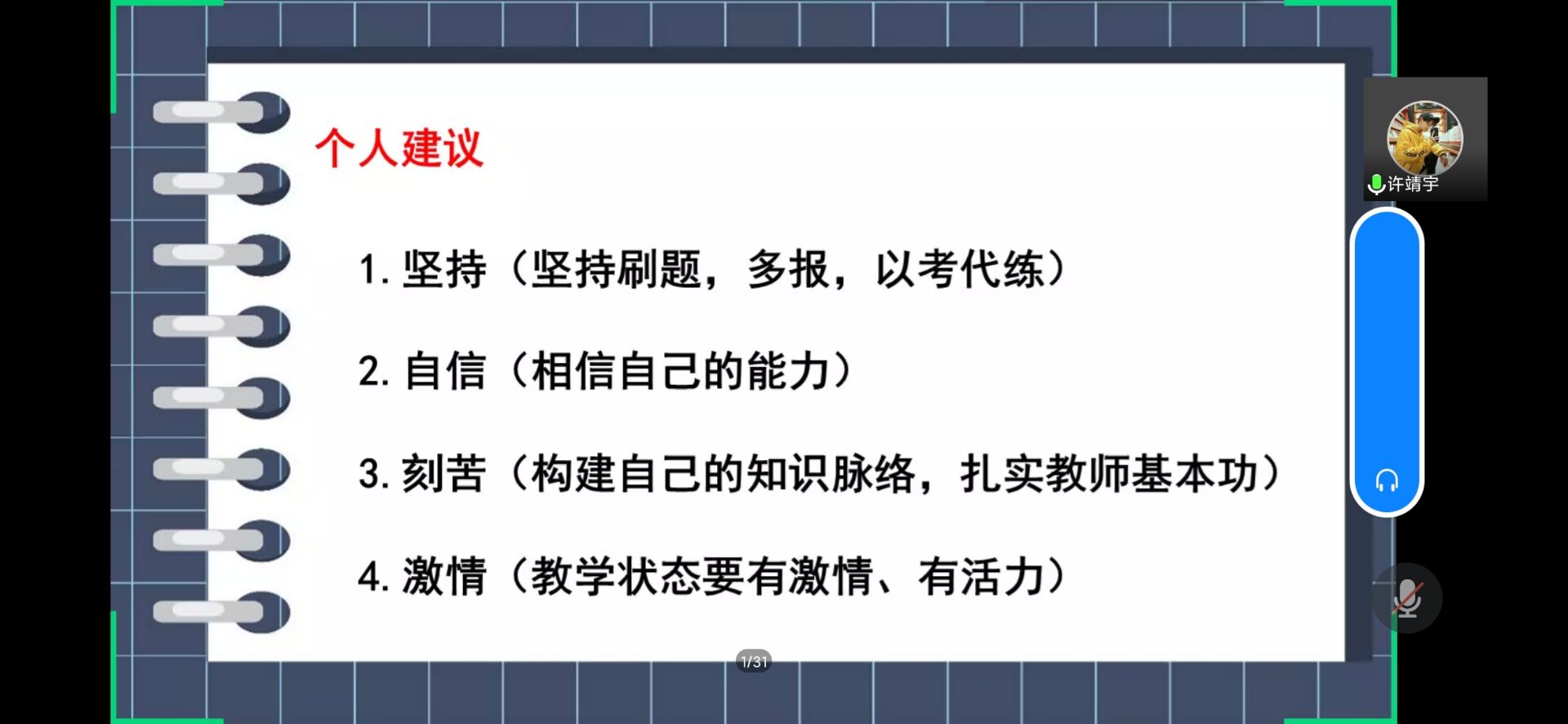 最后由许靖宇学长分享了他的考编以及考研经历,并对杨丽金学长的分享做出了补充。其中关于考编,学长着重讲解了有关面试流程的具体细节,也分享了他自己在面试中遇到的问题以及教师基本功的重要性。