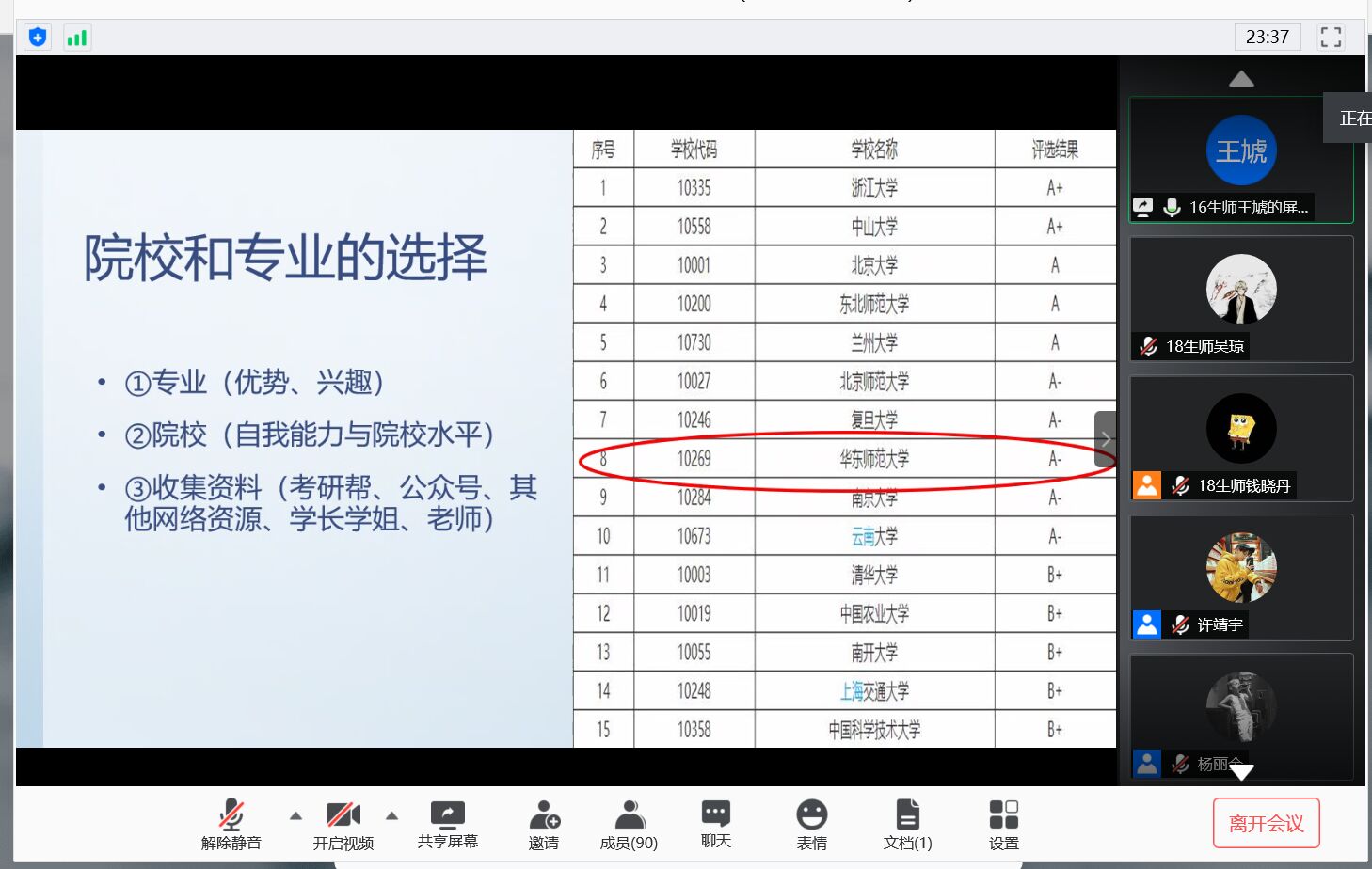 为了提高同学们对考研考编的认知度,了解考研以及考编的形式,制定明确的规划,6月8日下午16:00生化院17、18级生物师范、生物制药专业举办了一场线上考编考研交流会。本次活动邀请了2016级生物师范班王虓、杨丽金、许靖宇三位优秀的学长学姐为同学们传授考研心得和考编技巧。