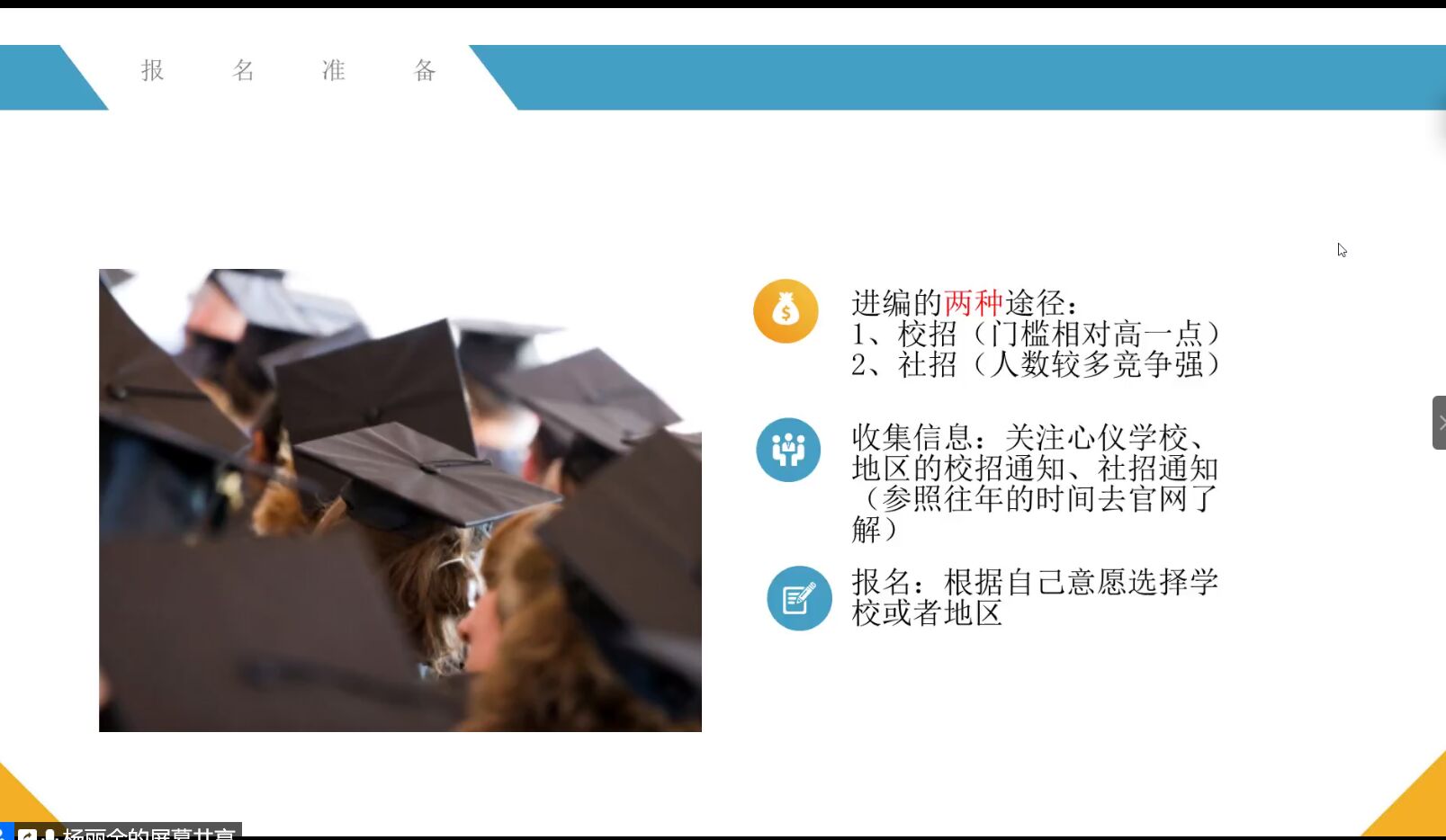 紧接着由杨丽金学长讲述了自己在考编上的经历与心得,他从考编经历讲述、技巧分享、问题解答等方面对考编进行了详细的说明。包括从自身的考前准备,如复习资料的选择以及在复习时侧重等几方面开始介绍,随后讲述了考编报名中校招和社招的两种放式以及考编信息的收集和选择地区的方法,最后传授了他在面试时自己的心得,告诉大家自信是最重要的。最后为解答了大家提出关于考研和考编的问题。