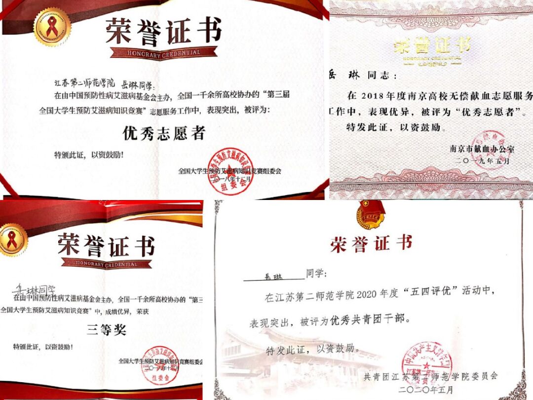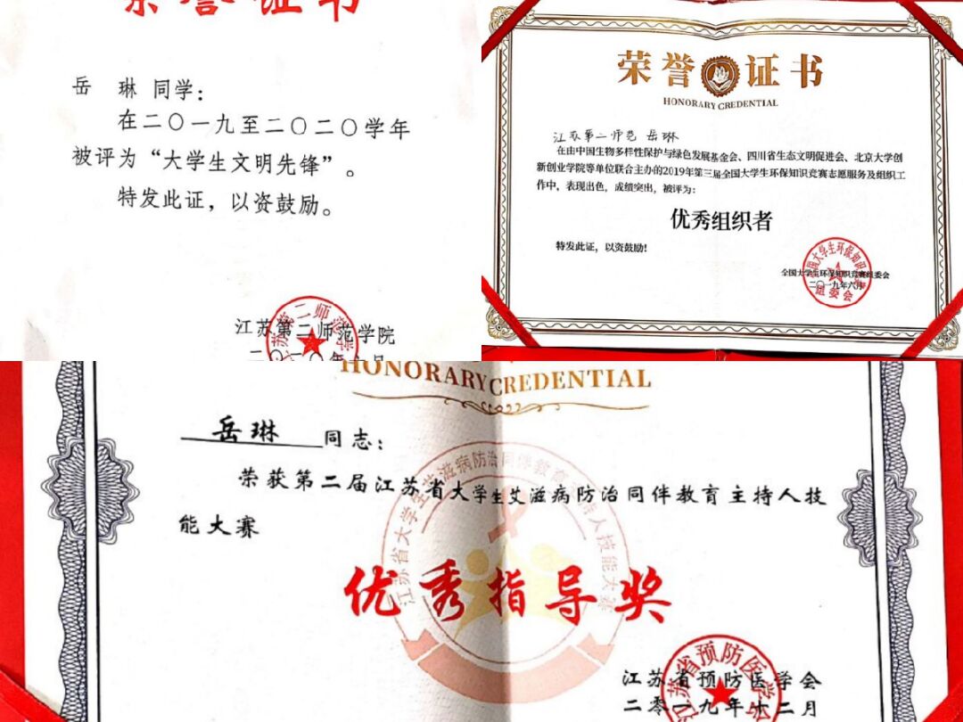 2017-2018年第一学期校级奖学金、2018-2019第二学期校级奖学金,2017-2018年第一学期、第二学期青协优秀志愿者、2018年5月优秀共青团员、2019年优秀共青团员、2018年12月“校级优秀青年志愿者”、2018年12月防艾月“国家优秀志愿者”、2018年12月全国防艾知识竞赛三等奖、2019年5月南京市优秀志愿者、2019年6月优秀组织者、2019年11月校级暑期社会实践先进个人。