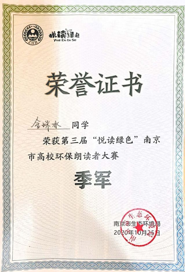 10月25日上午,由南京市生态环境局主办的第三届“悦读绿色”南京市高校环保朗读者大赛决赛圆满落幕。我校生命科学与化学化工学院19级科学教育专业学生金姝冰经过层层角逐,最终喜获季军。