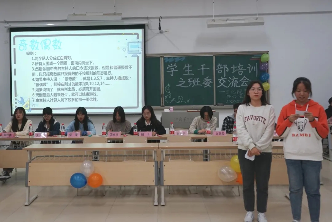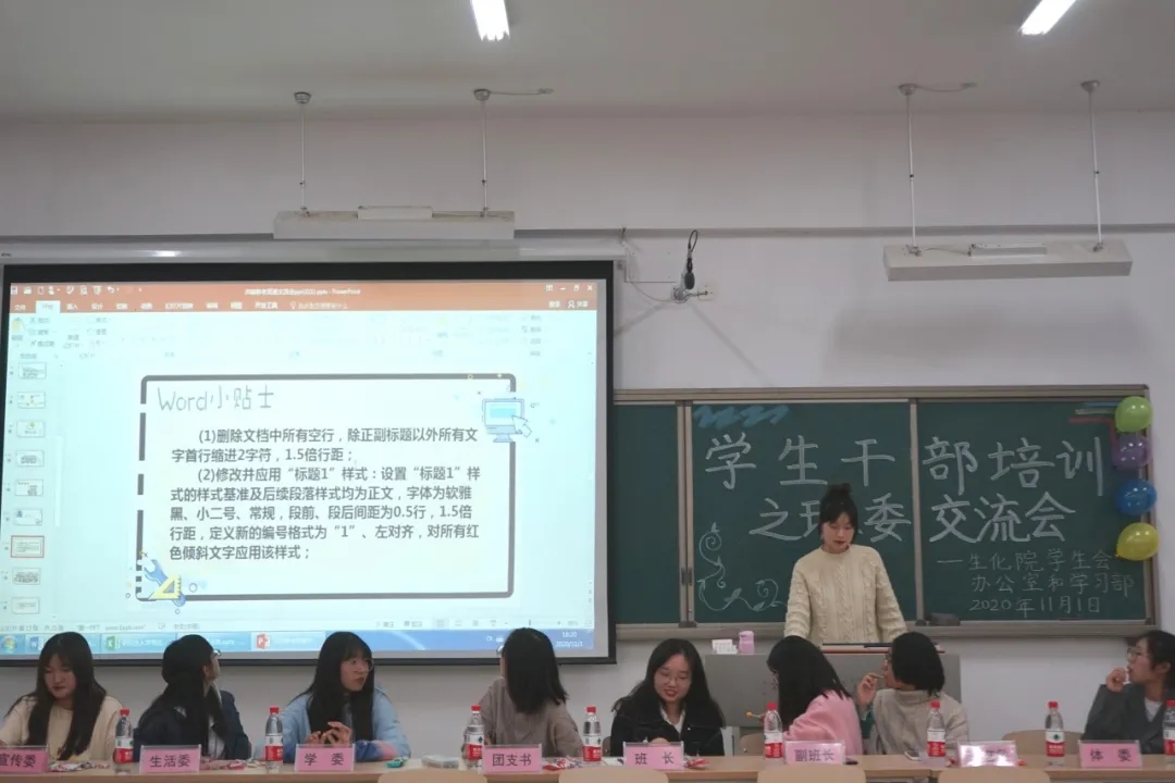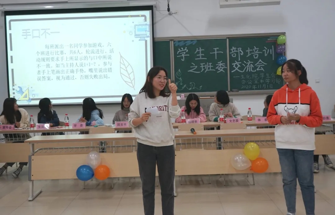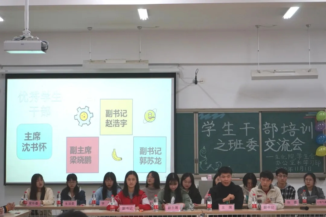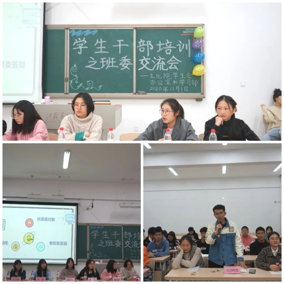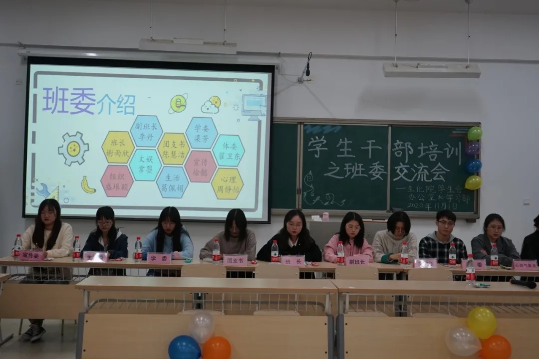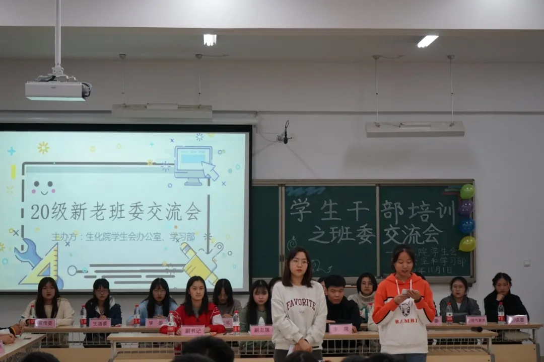 11月1日晚,为了让新生班委更好的熟悉自己的各项工作,提升他们处理班级事务的能力,生化学院举办了学生干部培训之班委交流会。本次交流会由19级科学教育班的施悦和19化学师范班的梁文婷主持,大家快来和小编一起看看现场吧。