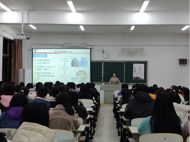 乔部长首先通过语言和视频向同学们介绍了南京市质检院的发展概况,详细讲解了产品质量检测的过程以及一份合格的检测报告的内容与要求,明确并清晰的指出成为一名合格的质检人员应该具备的专业能力和素养。同时介绍了目前国内检验检测行业的发展现状,分享了自己的从业心得,鼓励同学们扎实掌握专业知识和技能,提高团队协作能力,努力成为一名合格的授权检测人员!同学们深受鼓舞,并积极就从业资质等方面问题进行了现场咨询。