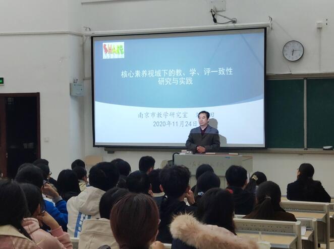 11月24日,南京市教学研究室化学教研员刘江田老师应邀来院为同学们作了题为《核心素养视域下的教学评一致性》的讲座。生化学院副院长杜攀、化学专业负责人花书贵、吴海霞老师、黄斌老师和化学(师范)专业的同学们聆听了讲座。