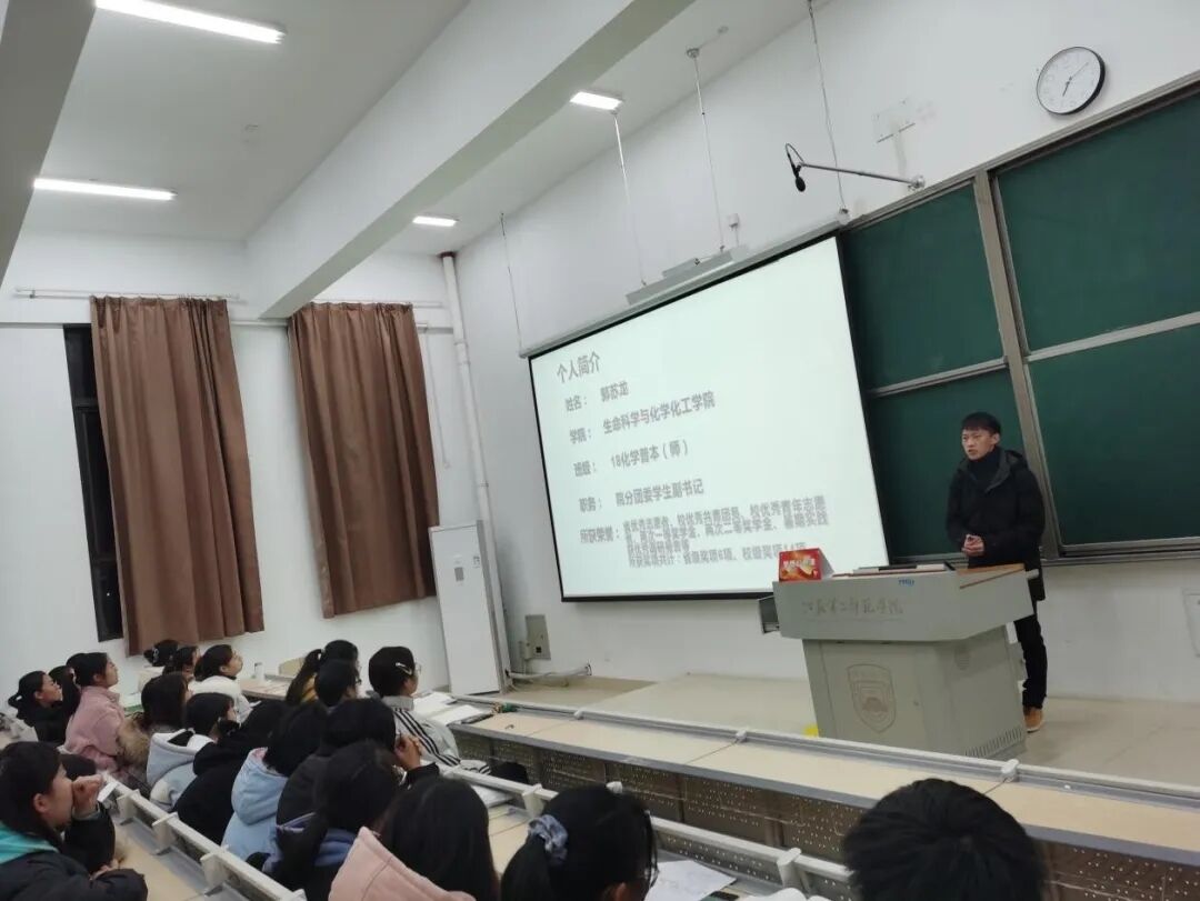 接着,生化院分团委学生副书记郭苏龙从自身对专业的坚守着手,引出“坚守初心,砥砺前行”的主题。大学生在寻找初心、牢记初心、保持初心的行动中,在向善、向美、向真的追求中,为理想而奋斗,这样的青春才有意义。同时,他也解答了新生在转专业方面的一些困惑与要求,鼓励他们守正初心,坚定信心,保持恒心,坚实迈向未来。