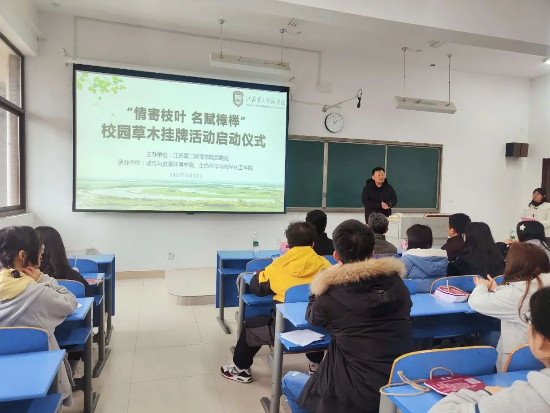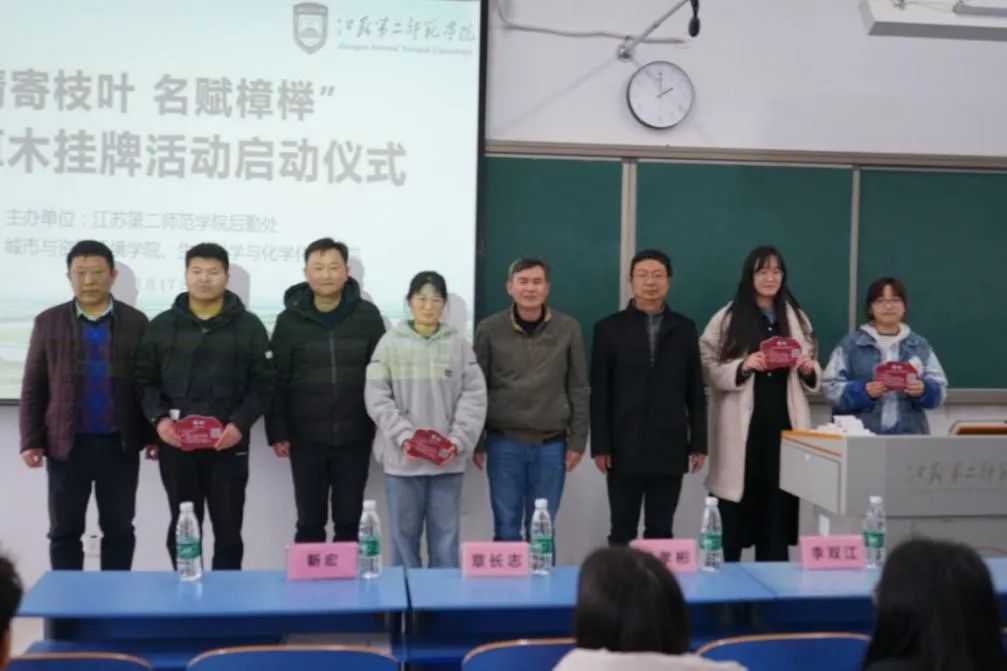 绿化孕育了文明,为了更好地生存发展,我们必须关心爱护绿色生命,不遗余力地进行生态建设。为贯彻落实“建设绿色、文明、和谐校园”的要求,创造优质的校园生态环境,拓展学生的生物基本常识,传播树木生长的环境要求及相关信息,由江苏第二师范学院后勤处主办,城市与资源环境学院和生命科学与化学化工学院共同承办了此次“情寄枝叶 名赋樟榉”的校园草木挂牌活动。