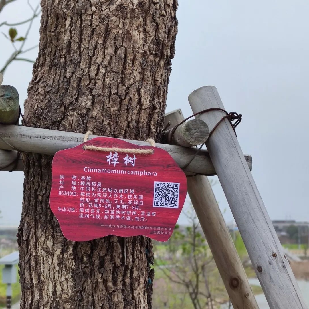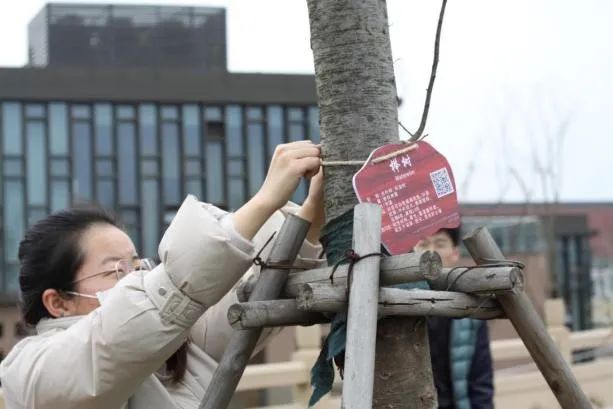 活动接近尾声,同学们把属于自己班级的铭牌挂在了榉树的树干上,形成了一道道美丽的校园风景。