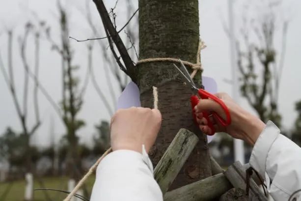 随后,主持人为大家讲解了挂牌的具体方式:班级代表找到指定的树木后,按班级定点挂牌。根据树木主干粗细截取部分麻绳,拿着绳子一端,从树木铭牌左边的孔穿进去,将绳子的另一端从右边的孔穿进去,最后系在树上即可。