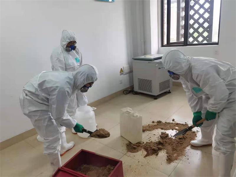 活动第三阶段为危化品泄露处置演练,主要由学院领导、实验中心老师和部分开展毕业论文学生参加。首先学生发现342实验室废液桶破损,废液泄露,气味刺鼻,紧急通知责任老师,蒋功成院长第一时间发布疏散消息,并安排3人组成救援队,穿防护服、防护鞋、防毒面具、防护手套,处理泄露。拉警戒线、疏散学生、开通风、消防沙阻隔掩盖泄露、转移废液,所有动作一气呵成,以最快速度完成泄露处理工作。