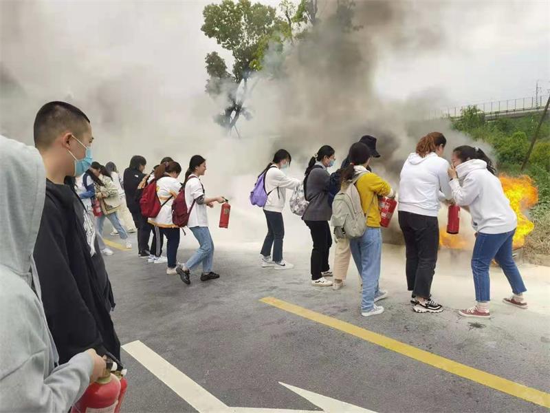活动第二阶段为灭火器实操演练,由溧水消防救援大队宣传员韩建翔讲授干粉灭火器使用方法,参加演练学生以3人一组的方式,使用干粉灭火器进行实操灭火。参加演练的教师也进行了灭火器实操灭火。