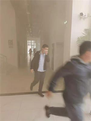 活动第一阶段为应急疏散演练,实验楼模拟火情,拉响烟雾弹后,学生在火警警报提示下,在现场保安、老师等工作人员的引导下,快速有效的从火场进行撤离,同时由微型消防站组成的救援小组迅速进入火场,开展火情侦察、火灾扑救等工作。消防救援力量在接到报警后,第一时间赶赴火场将火扑灭。
