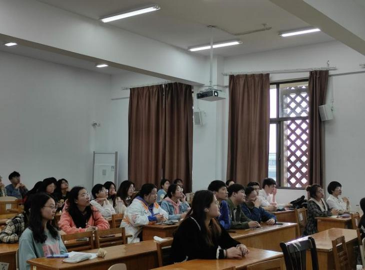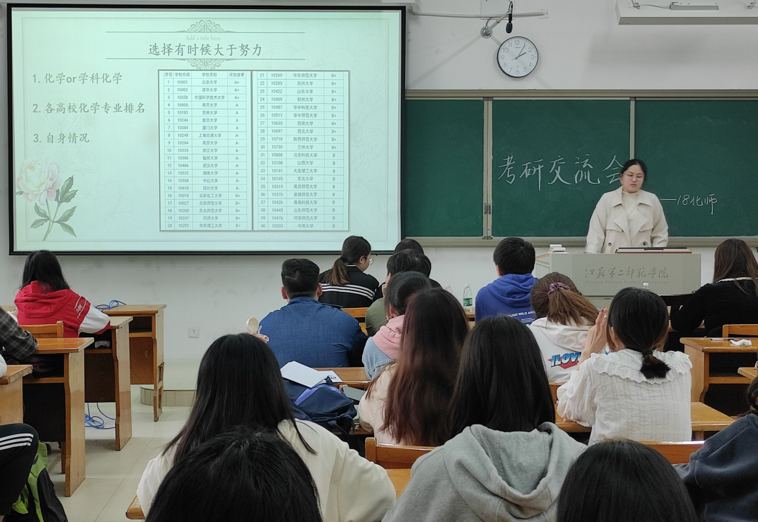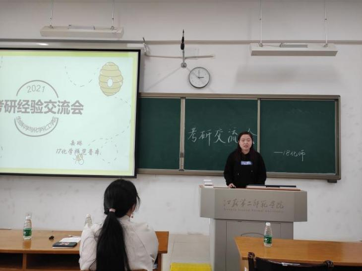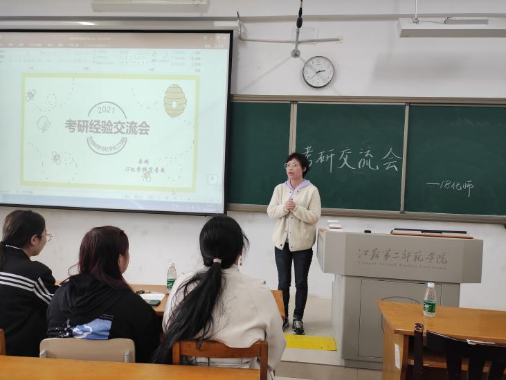 春香四溢,蛙声传情,17级考研上岸的学生带着她们的丰收与喜悦来到化师班开展考研经验交流会,以此更好地帮助18化师班同学确定自己的考研方向、19化师班同学了解最新的考研形式与安排,让大家及时对自己的大学学习生活和未来发展做出正确的规划。本次考研经验交流会于4月21日下午2点在博1-313举行,由18化学(师范)班与19化学(师范)班联合举办,出席本次会议的有生化院副院长杜攀、18化学(师范)班主任许翠霞、17化学(师范)班主任钱广盛及2017级化学(师范)班的学生朱程程、王艾如、岳琳。