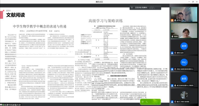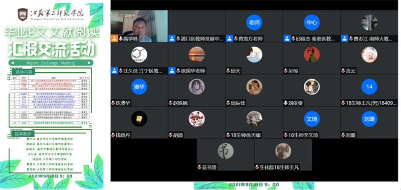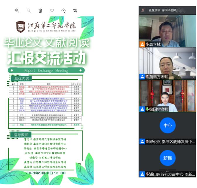 为帮助毕业论文组本硕十四位同学能够根据自身选题更科学有效地进行文献阅读,提升研究素养,汲取研究智慧,通过借鉴交流了解自身可能的提升空间;同时更需要指导老师和专家给予学术和智慧引领和支持。江苏第二师范学院生命科学与化学化工学院生物学教育方向毕论组于2021年9月18日9点通过腾讯会议举行了热烈的文献阅读线上汇报交流活动。参与活动的有徐国华老师、黄雪方老师,还特别邀请到了南京师范大学教师教育学院曹志江教授、南京市浦口区教师发展中心周新民老师、南京市秦淮区教师发展中心邱俊杰老师以及南京市江宁区教学研究室汪久佳老师三位生物学教学研究员。活动由高学林老师主持全程交流、讨论和指导。