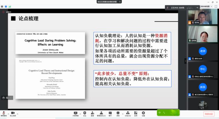第二个内容是汇报和交流所阅读文献的主要论点及研究方法。例如,刘依雯同学对认知负载理论和教学评价的定义和发展以及相关文献中的论点和研究方法就做出了较为详细的讲解。