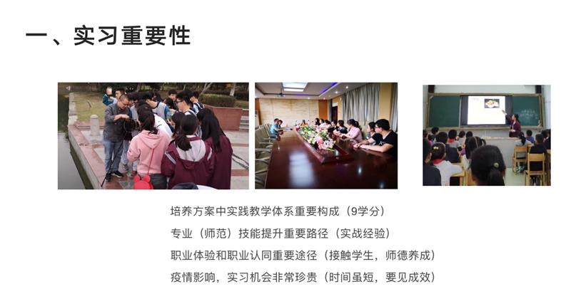 首先,朱院长重点强调了师范生教育实习的重要性,系统解读了教育实习的具体安排和基本要求,对同学们提出了殷切的期望,希望同学们能在实习中学习、实习中收获、实习中成长。蒋院长重点围绕教育实习质量强调了四点方面:要遵守实习相关纪律,要端正实习的态度,要灵活处理好实习与考研关系,要妥善处理好实习与毕业论文关系。最后陈建琴书记结合自已的教育教学体验勉励同学们要珍惜宝贵的实习机会,虚心好学,勤学苦练。服从实习学校工作安排,尊敬指导老师,爱护学生,做“四有”好老师。实习小组同学间团结友好,互相关心,共同进步。尤其要注意自己的双重身份,自觉遵守学校纪律和疫情防控各项要求,注意安全。预祝同学们教育实习取得圆满成功!