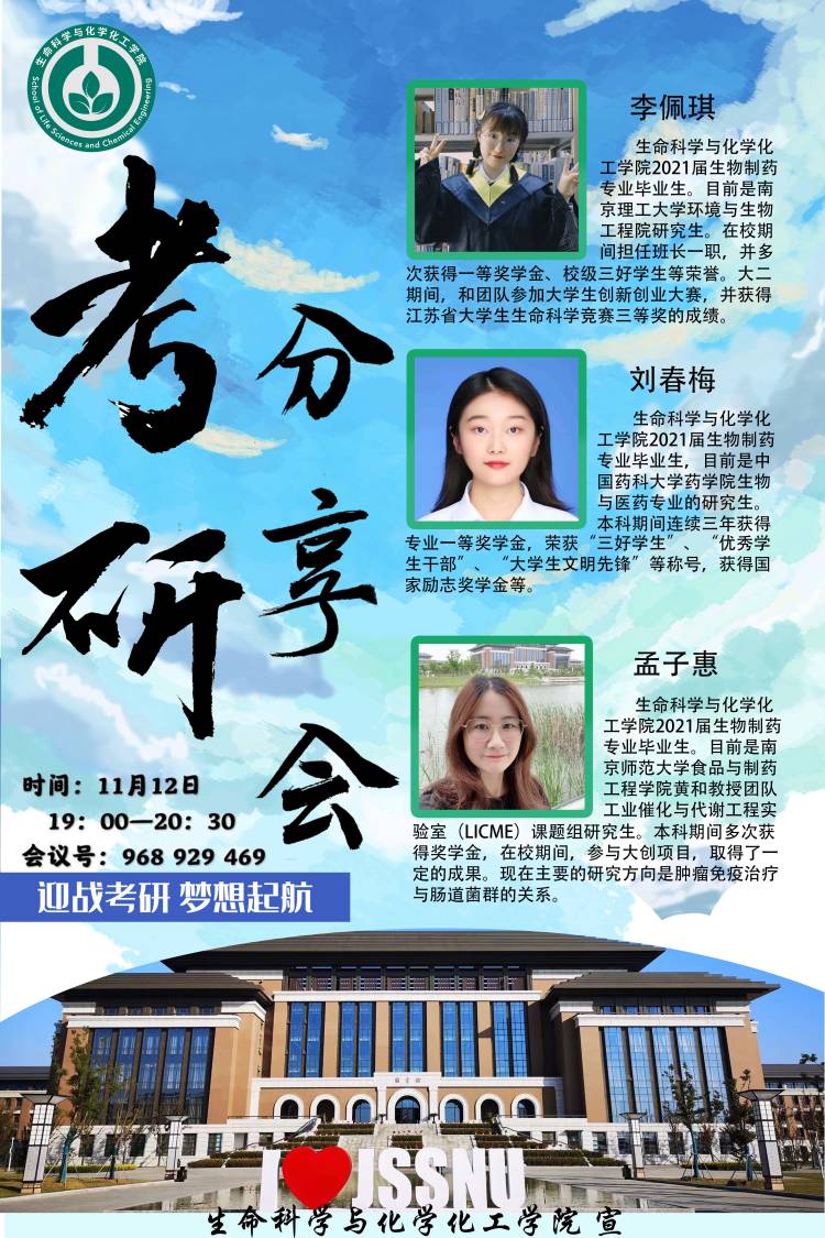 为了能够帮助生物制药同学们确定考研目标、熟悉考研流程 、学会复习方法,生化学院邀请了17级考研成功上岸的学姐们给同学们分享考研复习经验。本次考研经验交流会于11月12日19:00在腾讯会议举行,出席本次会议的有生化学院学工办主任董伟伟老师、17制药李佩琪学姐、17制药孟子惠学姐和17制药刘春梅学姐,以及学院大一至大三年级生物制药专业同学们。