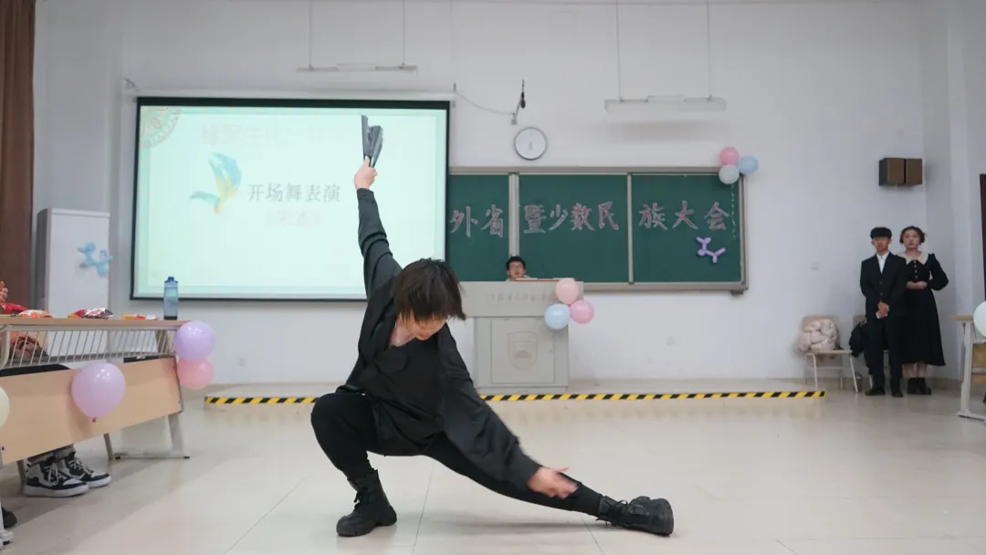 首先一开场就是一段震撼的舞蹈《朱雀》,一袭黑衣,一轮羽扇,时而温婉如水,时而飒爽如风,点燃了整个现场。开场舞之后,主持人便宣布生化学院外省暨少数民族学生交流会正式开始。