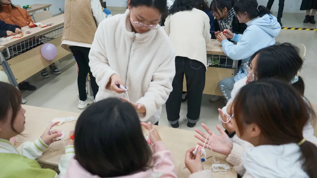 接下来一个小游戏就是猜方言,大家也都积极参与。听着全国各地不同的方言,不同的语调口音却流传的是相同的文化。猜方言过后便是小品《纯闺蜜》,展示着男孩和女孩之间的友情。“不要做什么”也是一款经典的小游戏,大家“勾心斗角”一步步将身边的人拉入“陷阱”。“编织体验”则让更多同学体会到了传统手工艺的精妙。在这样的氛围中,所有人的关系更近了一步。
