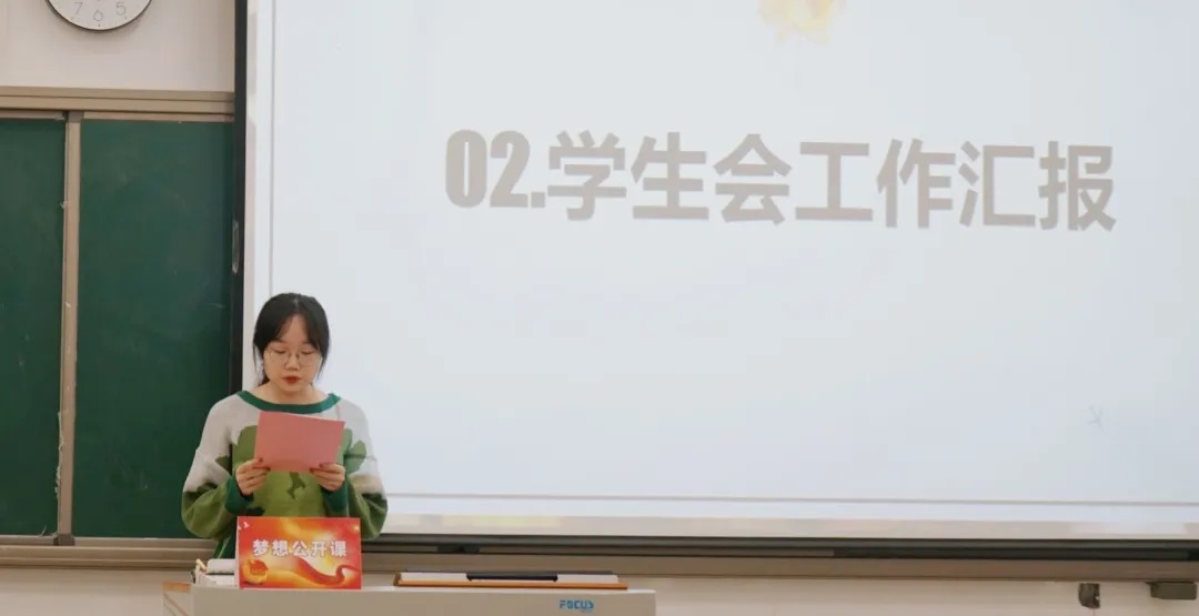 接下来是学生会主席谢雨欣进行工作报告。本次学生会的工作紧紧和习近平新时代中国特色社会主义理念相结合,并将此理念始终贯穿于每一件事。学生会工作以立德树人为宗旨,深化改革建设,响应国家号召协助每位同学学习四史、宣扬雷锋精神等,帮助生化院的学子成为新时代下的优秀青年。同时学生会也积极开展各项比赛和活动如三字一画等,丰富同学们的日常生活。最后,主席还公布了之后的工作日程,入学教育、反诈课程学习、文明宿舍评比等皆在如火如荼的准备。