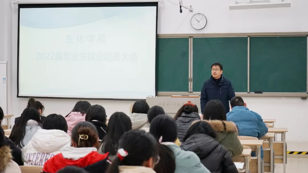 为了使2022届毕业生深入了解当今就业情况,进一步推进就业工作,帮助毕业生们顺利解决就业问题,生化学院于2022年1月5日上午10点在博1—108举行本次大会。院党总支副书记陈燏、学工办主任董伟伟参加大会。