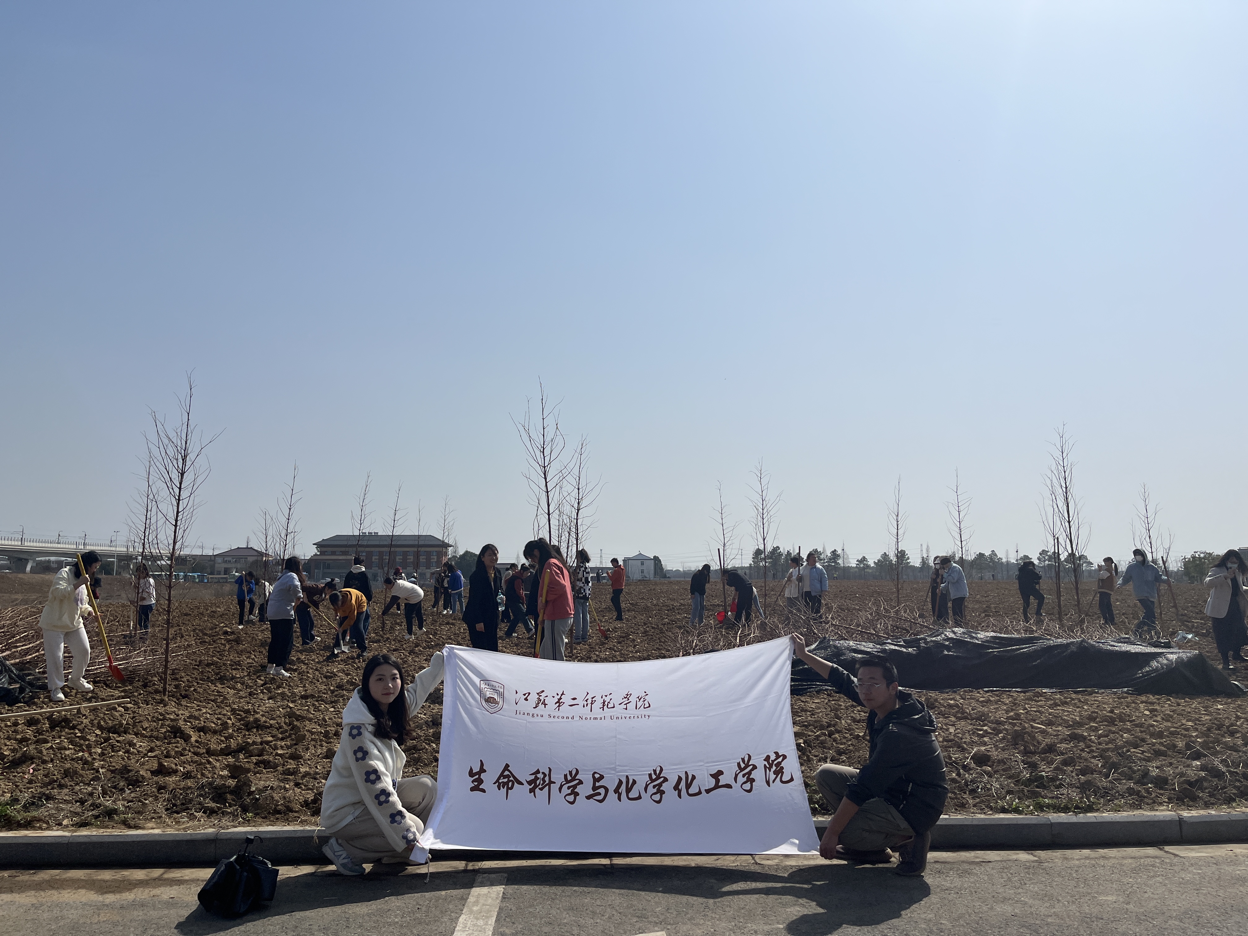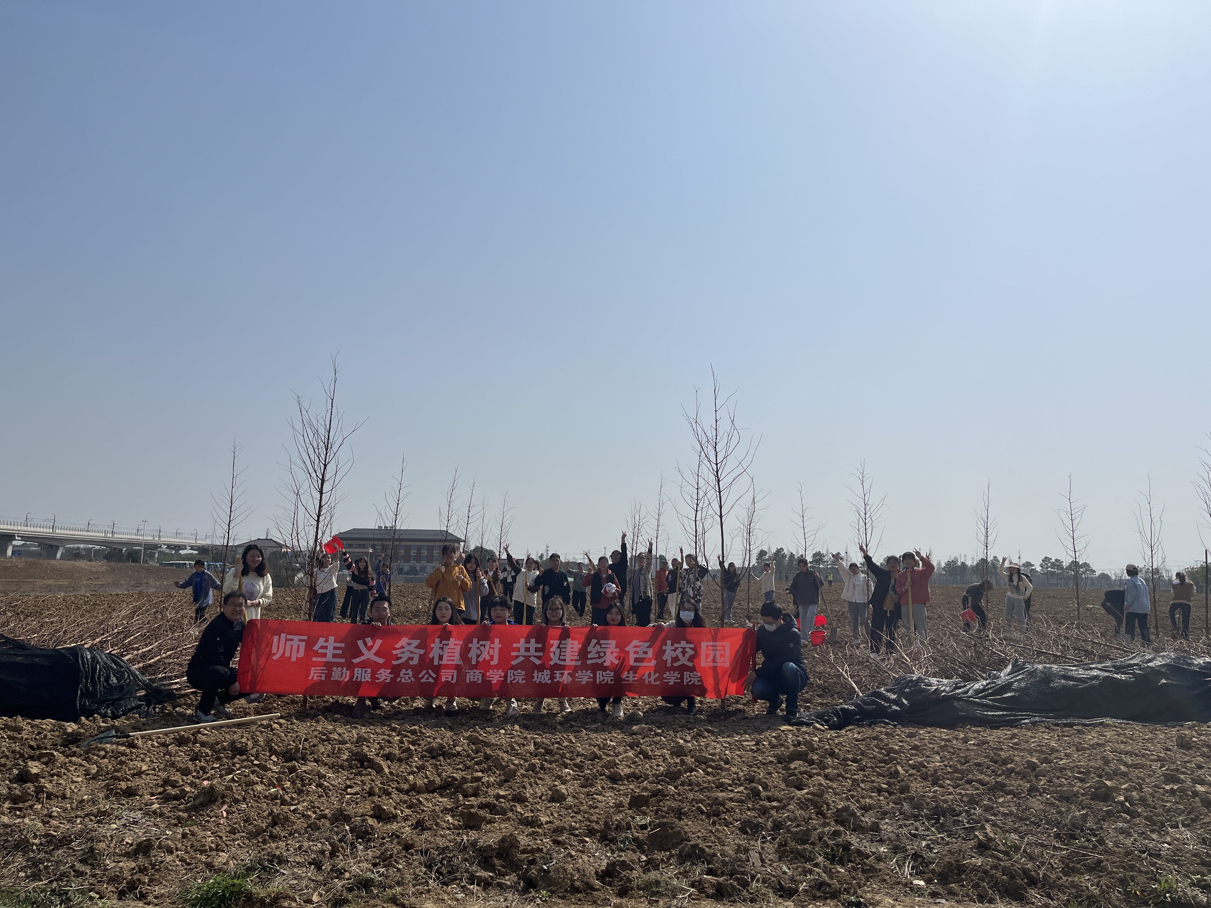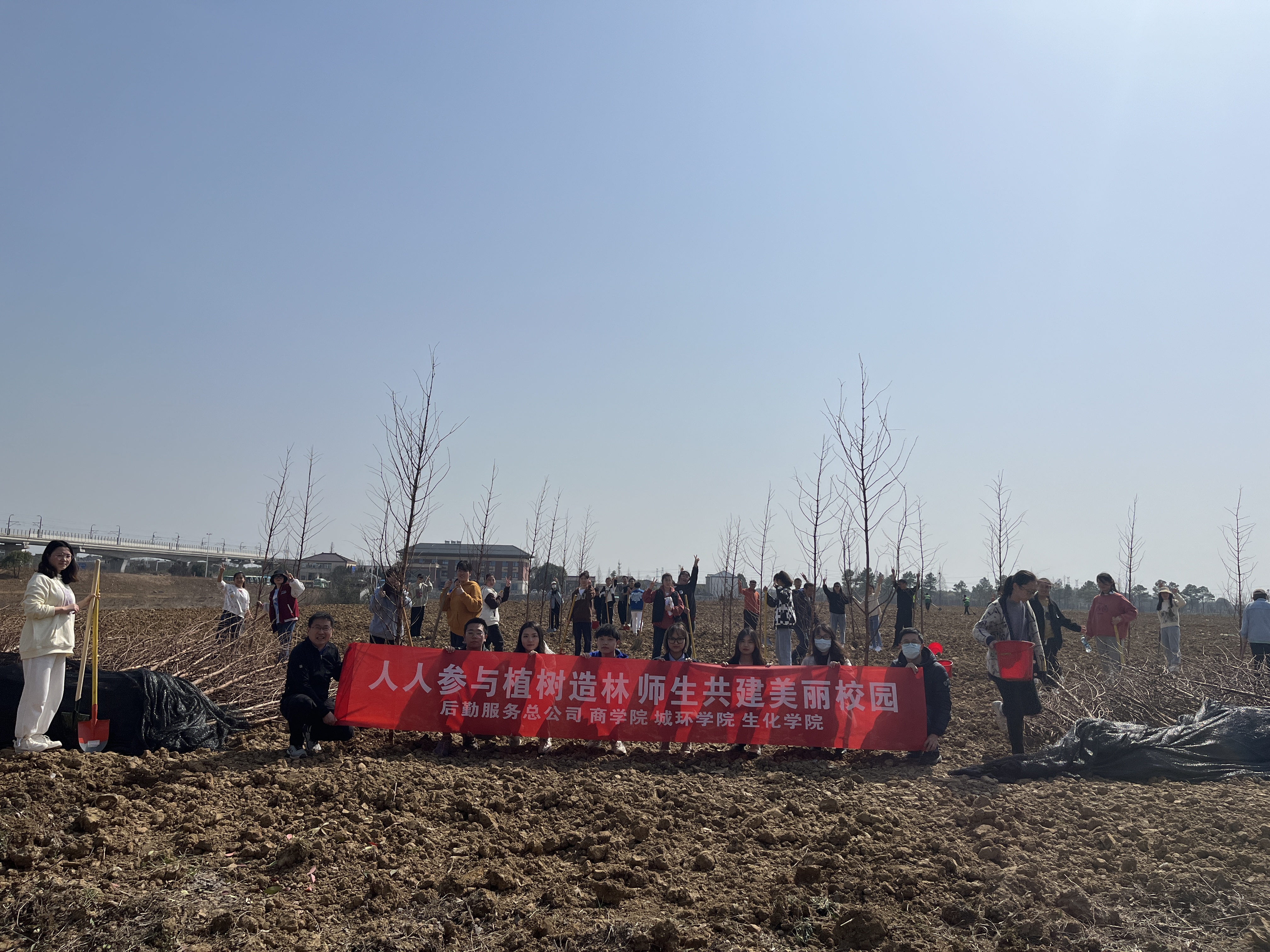 植树现场,校后勤处的老师在现场对大家进行详细指导和讲解,参加活动的同学们紧紧抓住当前春回大地、万象更新的有利时机,纷纷拿起铁锹,扶苗填坑、培土围堰、踩紧压实、浇水灌溉,每一道工序都一丝不苟,每一个流程都认真细致,大家分工协作,默契配合,栽下一颗颗树苗,呈现出一片热火朝天的劳动景象,放眼望去,一排排树苗盎然挺立,为原本光秃秃的荒地披上了一片新绿。