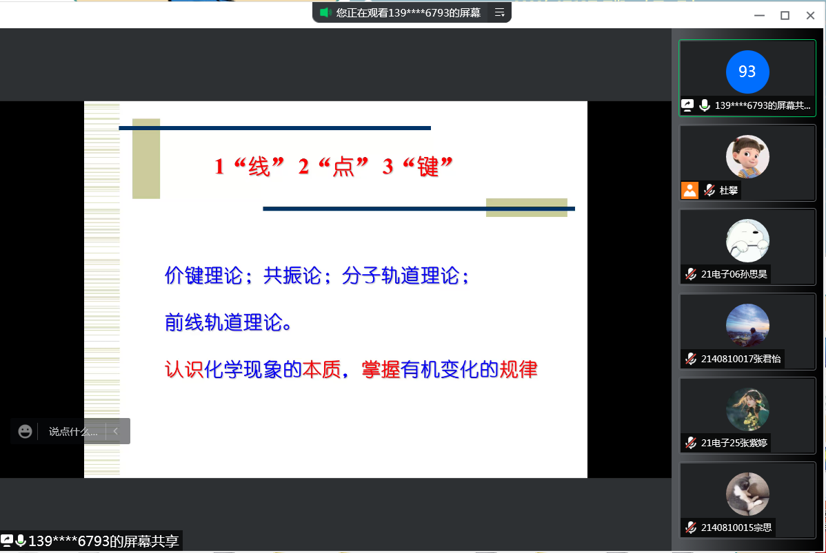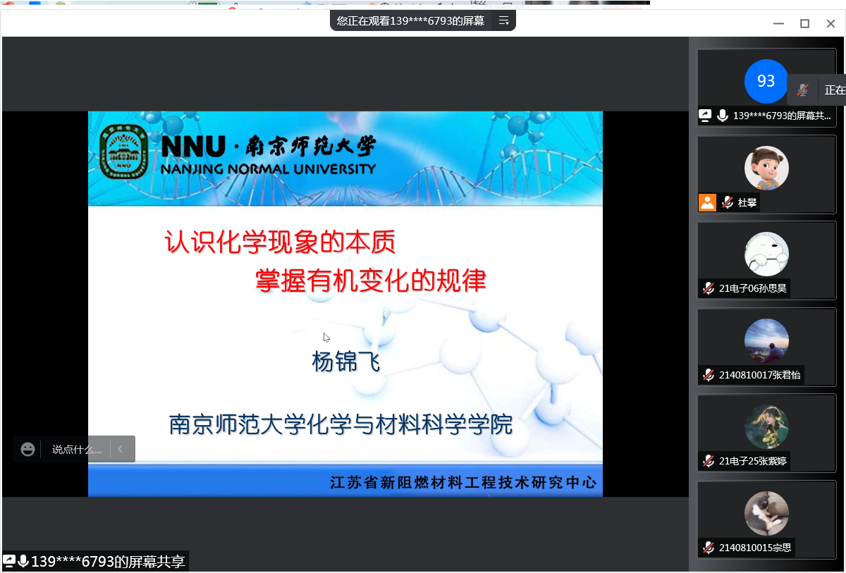 为拓宽师生视野,激发学生对有机化学课程的学习兴趣,为备战考研的“追梦人”们提供帮助,4月13日下午,南京师范大学杨锦飞教授应邀为我院师生做了一场题为“认识化学现象的本质,掌握有机变化的规律”的线上专题报告,报告会由生化学院副院长杜攀主持。化学师范及应用化学专业的全体学生及部分教师聆听了本场报告。