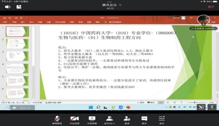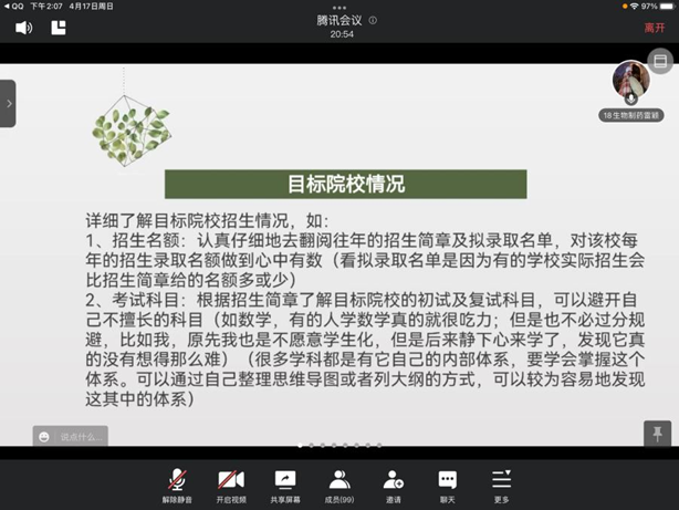 成功上岸了中国中医药大学的临床药学专业的倪嘉遥学姐给我们介绍了个人情况并给我们分享了择校及各科复习经验,并针对同学们的疑问进行了详细的解答,坚定了同学们的学习信心。