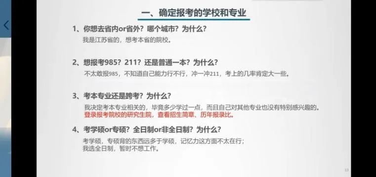 首先是成功上岸南京师范大学生物学专业的单欣琪学姐。学姐重点讲述了报考、复习流程和学习计划。分享中,她强调乐观心态的重要性,如果考试前心态出了问题,要及时调整策略,改善心态,然后坚持下去。