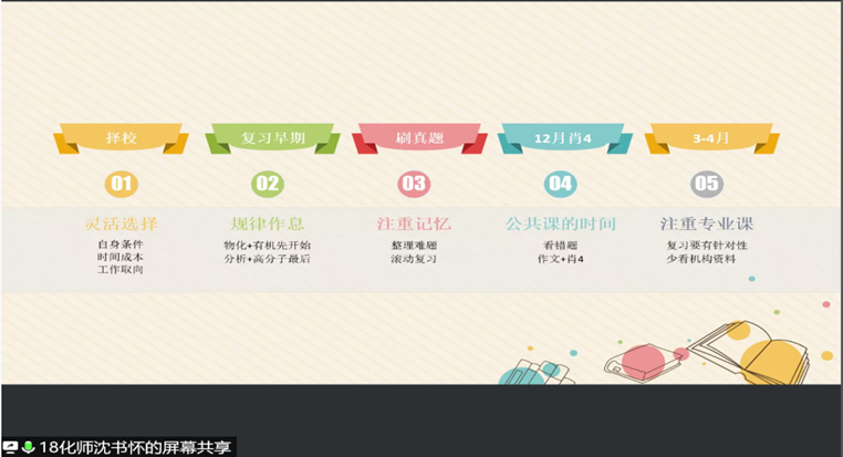 首先进行分享的是考上华东师范大学的分析化学专业的沈书怀学长。他就华东师范大学的考察科目和备考经验进行了详细说明。对于专业课,学长认为应以参考书目和真题为主。对于考研各个阶段的安排,他表示前期应根据自身条件、时间成本以及工作取向进行灵活选择,复习早期应有规律作息,中期应注重记忆,整理难题并滚动复习,后期应侧重于公共课的学习,末期针对专业课进行复习。