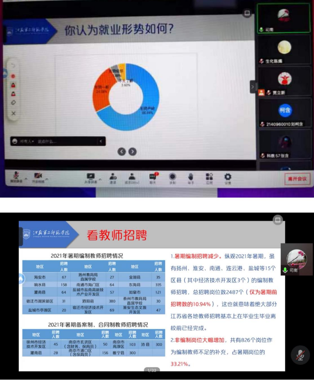 随后,司南对目前的就业形势及就业对策进行了深入讲解,详细介绍了我校毕业生的就业去向和升学情况,并对目前教师招聘情况进行了分析。他强调同学们要关注招聘信息,提早规划,抓住秋招好时机;提醒考研的同学应破除执念、调整预期、科学报考。最后司南希望同学们认清自己,瞄准切实有效的目标,保持一以贯之的努力。