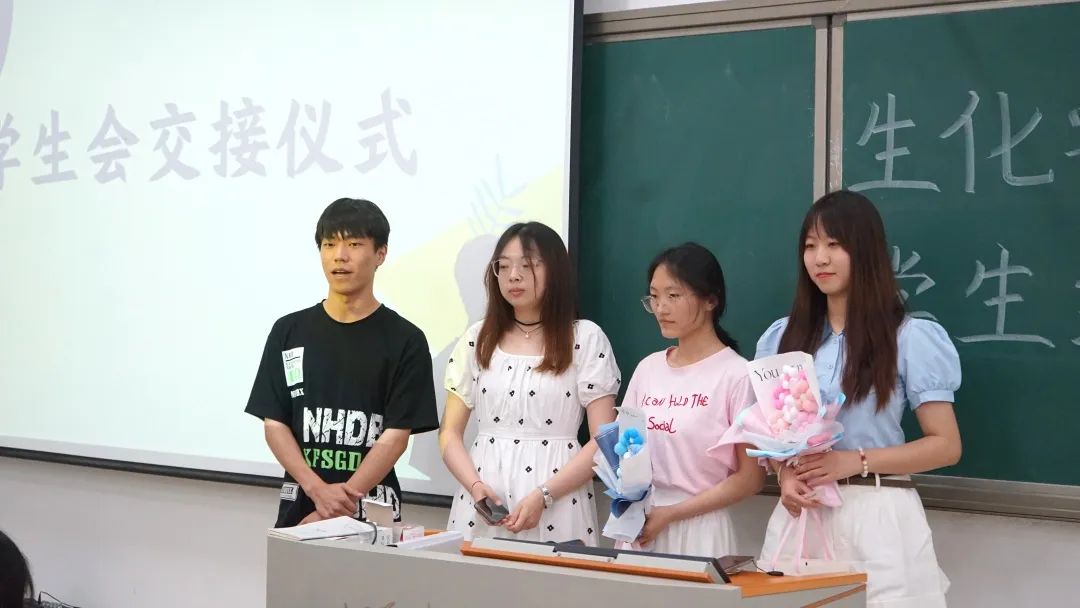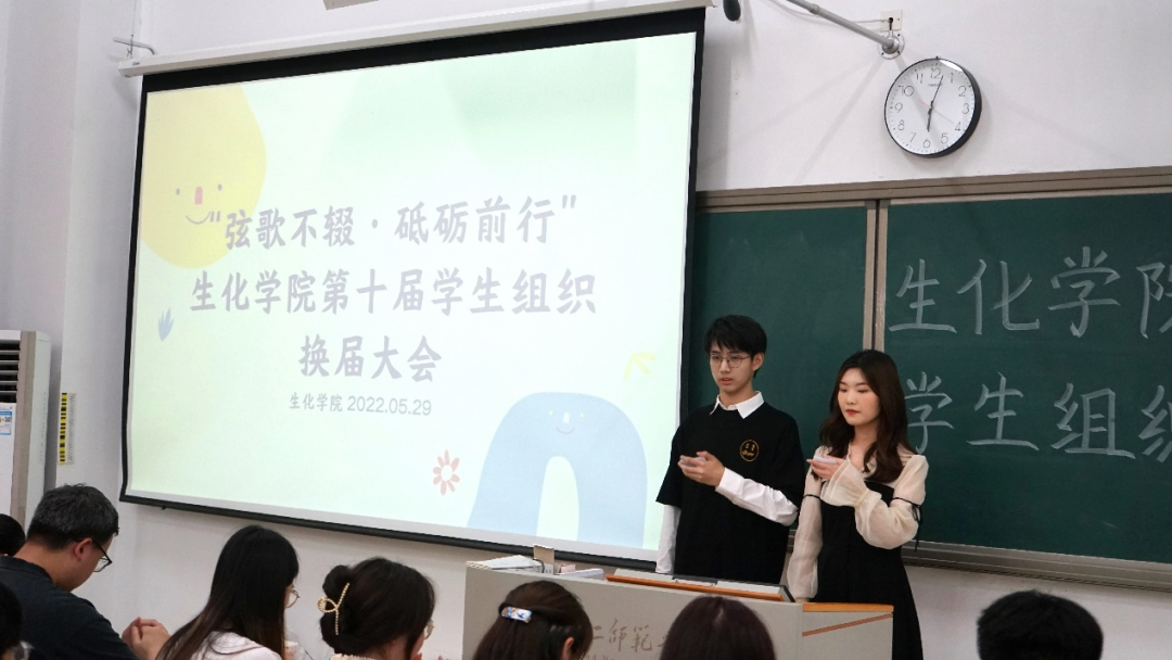 5月29日下午,“弦歌不辍,砥砺前行”生化学院第十届学生组织换届大会在B1-108举行。参加这次会议的有学生会、分团委、江豚保护协会、“自然而然”生态与环境保护协会全体成员。本次大会由学生会副主席陈逸潇和龚子悦主持。