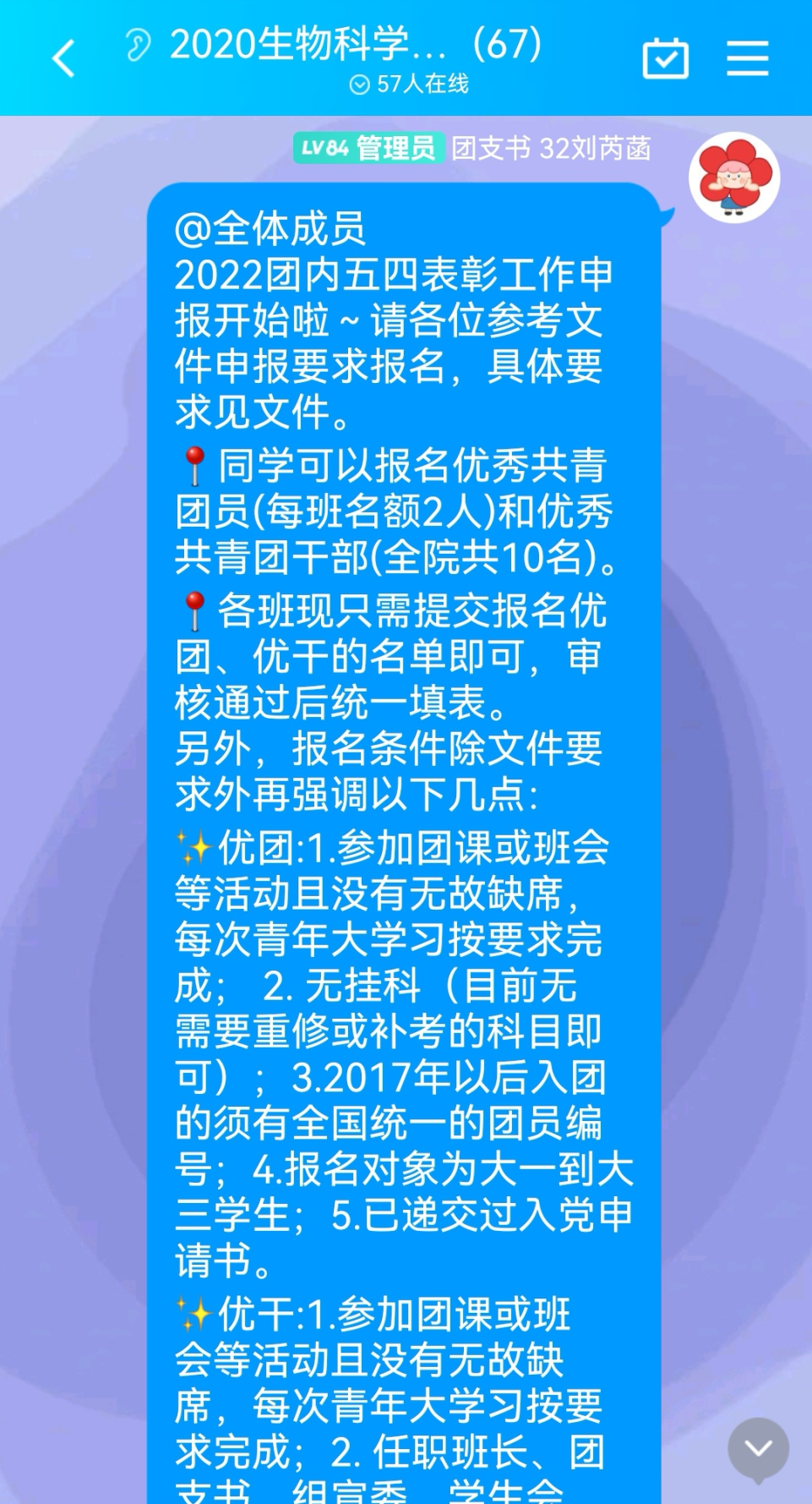 生物科学专业2020级普本班团支部紧紧围绕院分团委中心工作,充分发挥班级团员的优势,推动团支部加强建设、规范运行,不断提升组织力。团结带领本支部所有成员积极投入学院的各项活动,并取得了一定的成绩,得到了全体成员的认可。