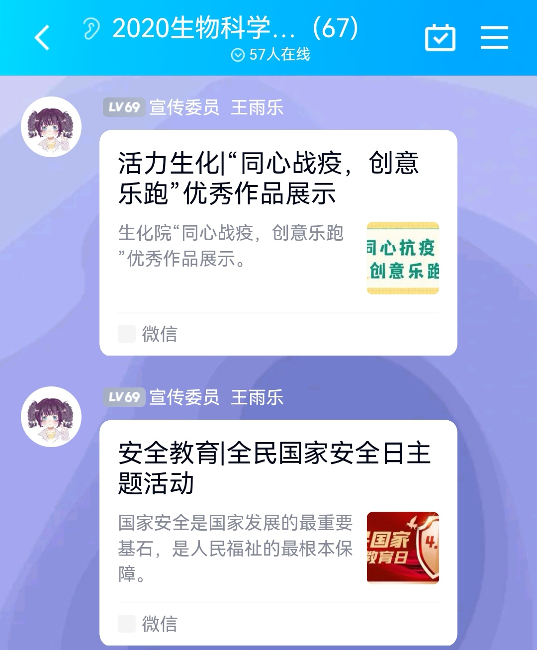20生物科学团支部同学积极参与每周的“青年大学习”团课,以增强自身的理论知识学习。团支部积极组织大家进行党史学习教育,积极引领大家深入学习贯彻党的十九届六中全会精神、全国两会会议精神并带领大家观看学习习近平总书记纪念抗美援朝大会讲话,来提升自己的核心素养。在学习中重视互动与实践,坚持理论与实际相结合。