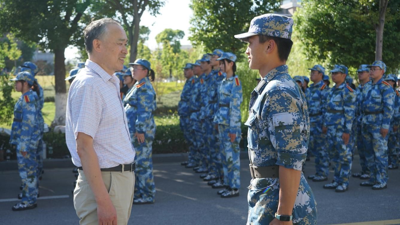训练过程中,生化学院院长蒋功成、党总支书记朱学伸、党总支副书记孙奕相继来到训练场地,他们既是以学院领导的身份,更是以参训学生班主任的身份,高度赞扬了参训学生们坚韧不拔的训练精神和积极昂扬的整体风貌。他们希望同学们以认真的态度对待军事训练,掌握基本军事理论知识,增强国防观念,厚植爱国主义情怀的同时,培养良好的生活作风和自理能力,为今后的大学生活打下坚实的基础。